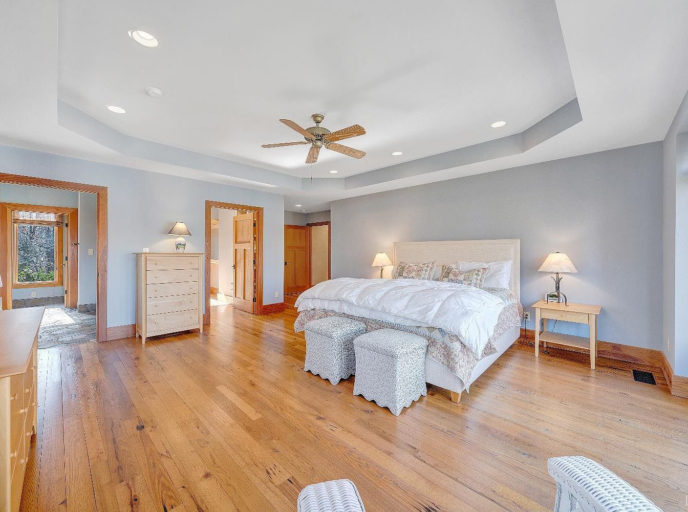 The bedroom features a spacious layout with a light blue color scheme on the walls, creating a serene atmosphere. A large bed with a soft, upholstered headboard is centrally placed, adorned with white bedding and decorative pillows. Flank this bed are two textured ottomans, offering additional seating. The floor showcases polished hardwood, enhancing warmth in the space. Natural light pours in through a window with a built-in bench, complemented by wooden frames. A single bedside table and a chest of drawers provide functionality without cluttering the design. A ceiling fan and recessed lighting add to the room’s cozy ambiance.