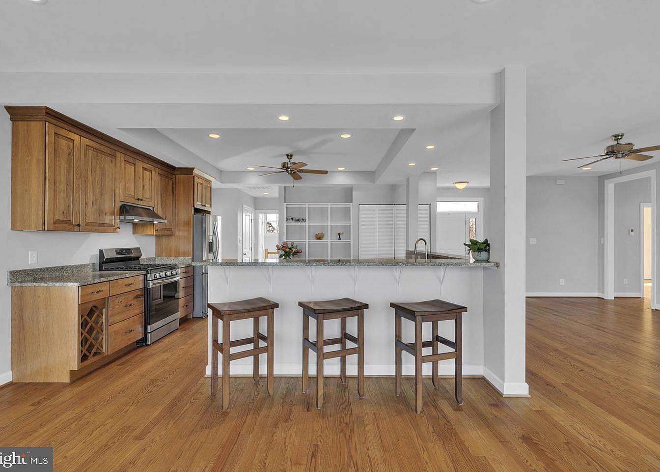 This spacious kitchen showcases a blend of modern and rustic aesthetics. Warm wooden cabinets with a rich finish contrast against the smooth granite countertop. A centralized island provides casual seating with three wooden barstools, inviting gatherings. The room features a neutral color scheme with light gray walls and hardwood flooring, enhancing brightness and openness. Recessed lighting and a ceiling fan keep the atmosphere airy. Stainless steel appliances complement the warm tones, while a small plant adds a touch of greenery. Open shelving in the background maintains a clean look, contributing to the functional yet stylish design.