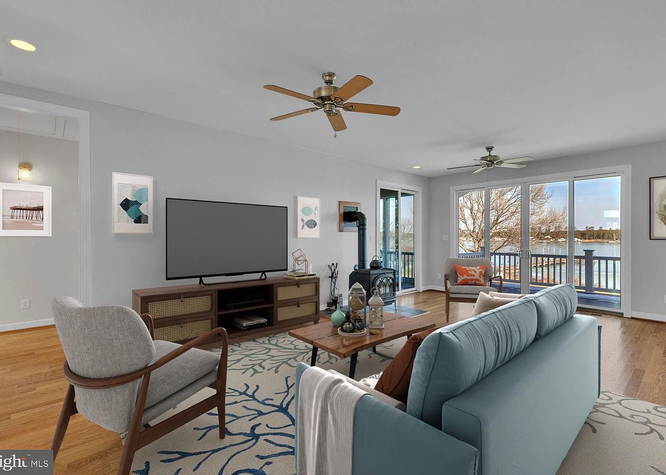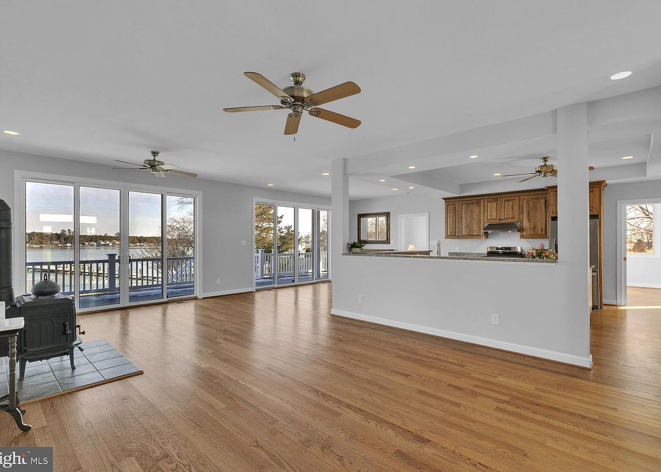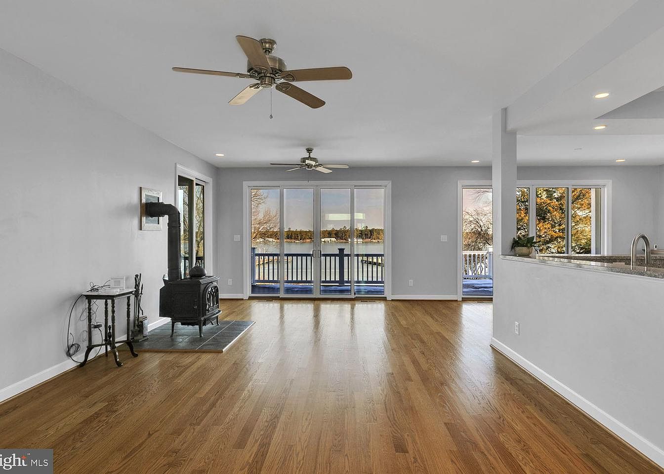 A spacious living room features large windows offering stunning views of the water. The walls are painted in soft gray, complementing the warm hardwood flooring that adds richness to the space. A black wood stove sits against one wall, drawing attention with its classic appeal, resting on a tiled base. Opposite, a sleek countertop hints at an adjoining kitchen area, where modern design meets functionality. Ceiling fans provide a cooling breeze, enhancing comfort. Natural light floods in, creating an inviting atmosphere that blurs the line between indoor and outdoor living, making it perfect for relaxation and socializing.