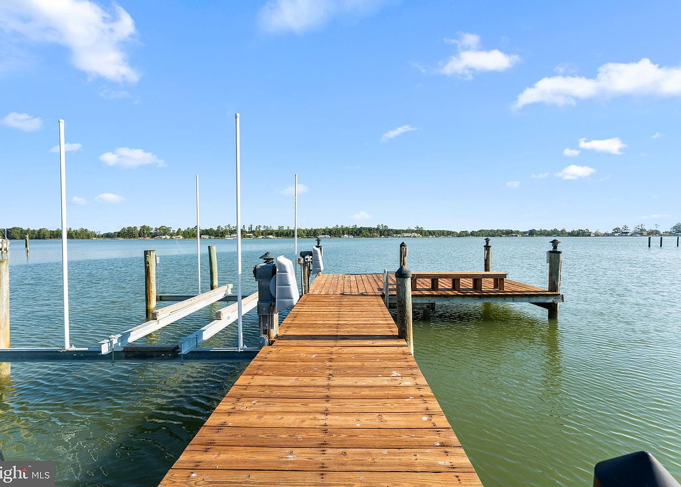 A wide wooden dock extends over calm waters, creating an inviting outdoor space. The dark wood planks contrast beautifully with the greenish hue of the water below. Vertical white pilings rise along the edges, suggesting boat mooring options. On the dock, metal boat lifts are positioned on either side, ready for watercraft. The sky above is a brilliant blue, dotted with fluffy white clouds, enhancing the serene atmosphere. In the distance, trees and structures line the shore, indicating a landscaped residential area. The overall aesthetic emphasizes a harmonious blend of nature and recreational use.