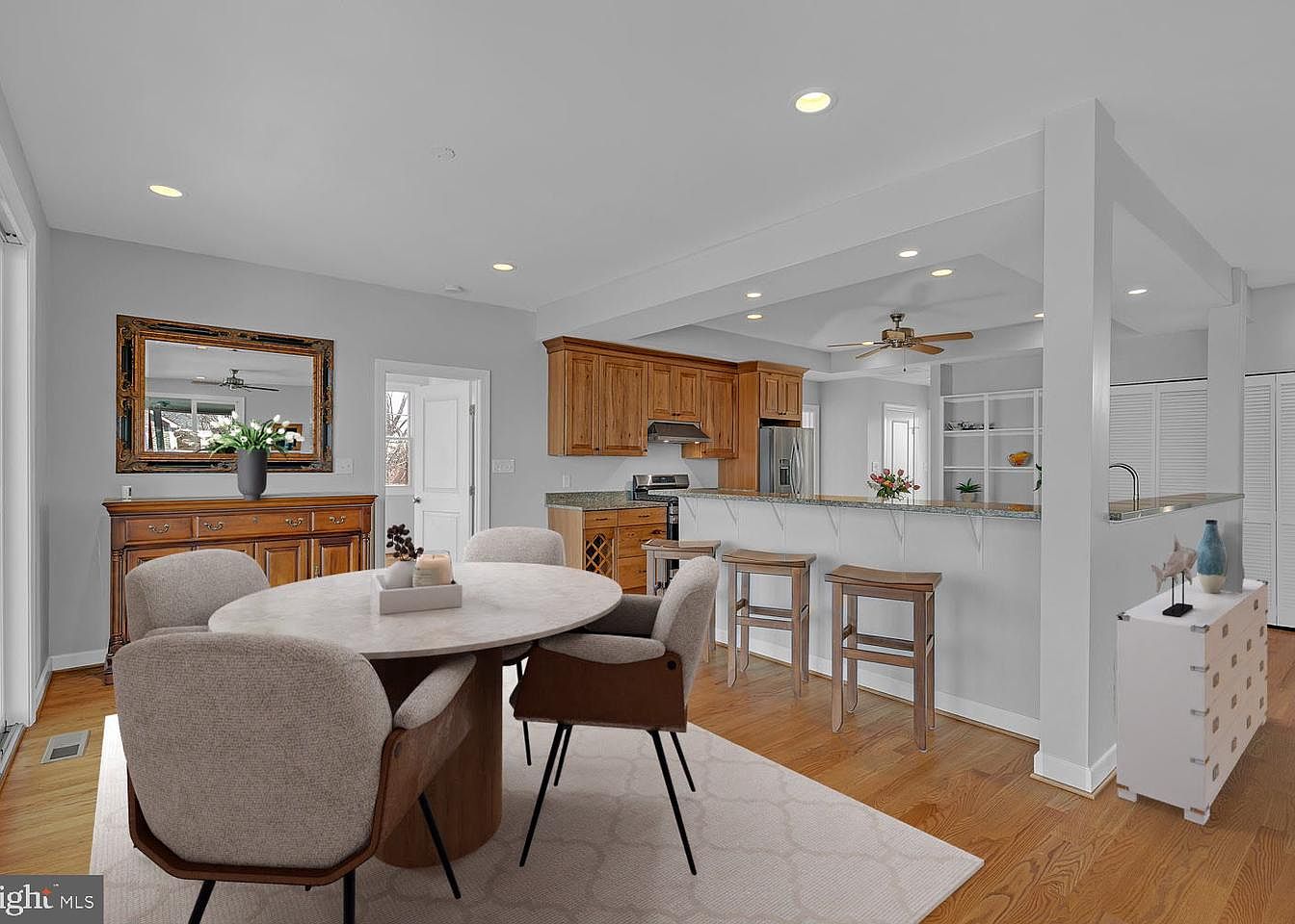 This dining area features a round, modern table surrounded by plush, upholstered chairs that combine comfort with style. The soft gray and beige color scheme creates a warm ambiance, complemented by the golden oak flooring. A mid-century modern buffet occupies one wall, topped with a large framed mirror, enhancing the sense of space. In the background, a sleek kitchen showcases wooden cabinetry and stainless steel appliances, while a marble countertop extends into a casual breakfast bar with matching stools. Bright natural light floods the area through large windows, adding to the inviting atmosphere.