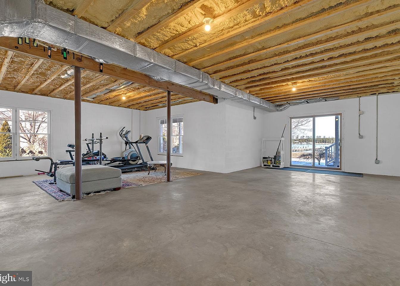 This spacious basement gym features exposed wooden beams and an insulated ceiling, highlighting its raw architectural charm. Pale white walls create a bright environment, contrasted by the natural concrete floor, which extends throughout the space for durability. A variety of gym equipment, including an elliptical and weight bench, are positioned for functionality. A soft area rug adds warmth to the room, while large windows on one side offer ample natural light and a view towards the outdoors, enhancing the room’s inviting atmosphere. The sliding glass door leads to an outdoor deck, further integrating indoor and outdoor spaces.