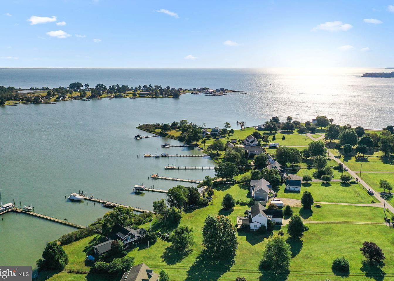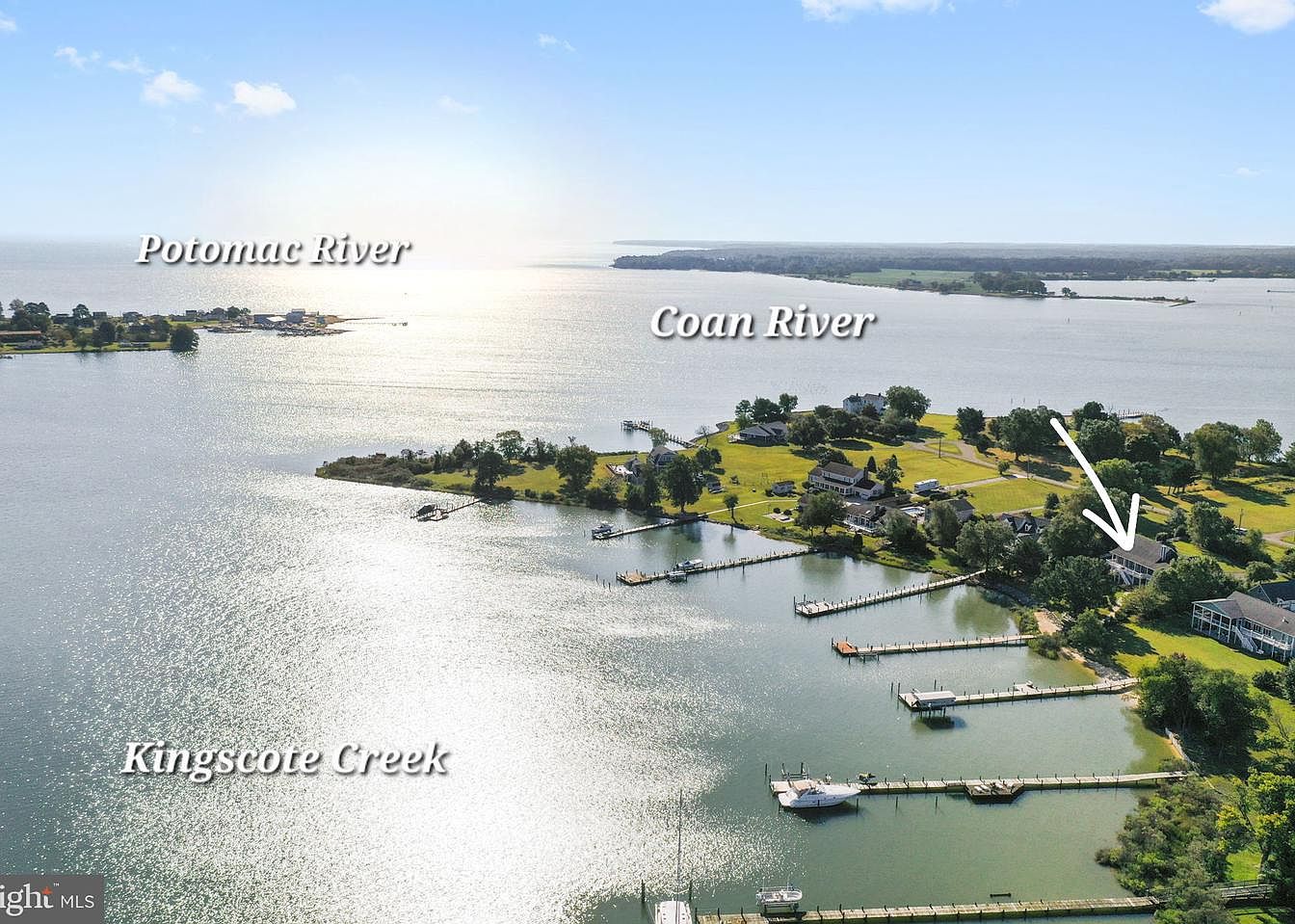 This image captures a serene waterfront landscape showcasing multiple rivers and creeks. The Potomac and Coan Rivers flow gently, reflecting sunlight across their surfaces, while lush green banks line the waterways. Docks extend into the water, providing access to boats, creating an inviting nautical atmosphere. The layout displays a combination of residential homes nestled among trees, emphasizing a peaceful, rural lifestyle. The vibrant greens of the lawns contrast beautifully with the shimmering blues of the rivers, promoting a sense of tranquility and harmony. This picturesque setting exemplifies charming waterfront living.