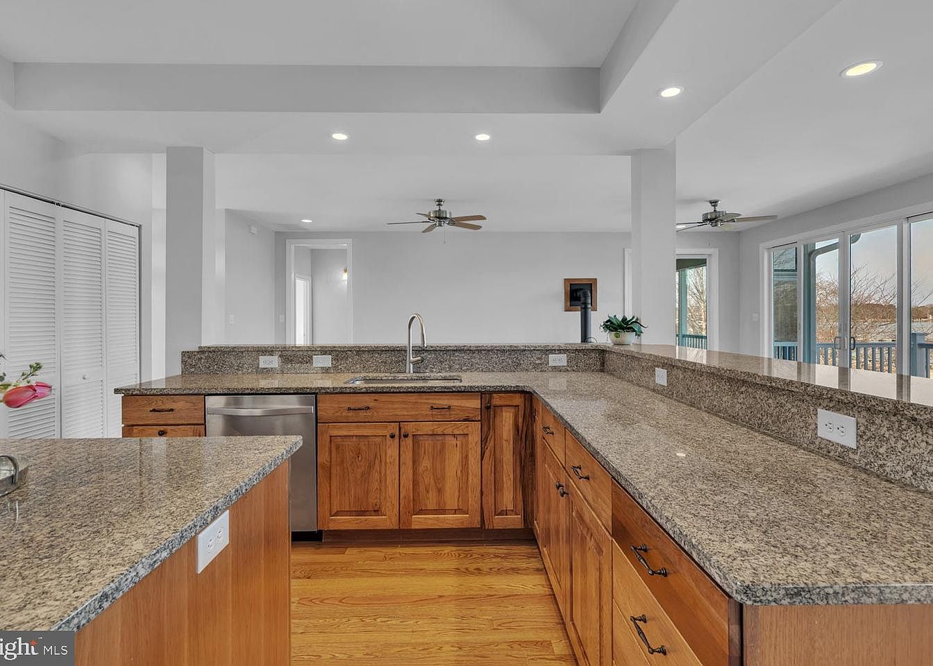 This spacious kitchen features a large, U-shaped granite countertop in a light gray hue with subtle veining. The warm, natural wood cabinetry beneath provides a rich contrast, supplemented by sleek black handles. Stainless steel appliances, including a dishwasher, integrate modern functionality with design. The floor is finished in polished hardwood, adding warmth to the space. Natural light floods the room through expansive windows, creating a bright, airy atmosphere. A minimalist color scheme of whites and neutral tones enhances the clean, contemporary feel. Ceiling fans provide cooling, while thoughtful layout offers easy movement and accessibility.