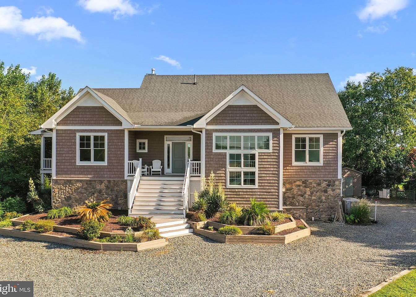 The exterior showcases a charming blend of stone and wood siding, emphasizing classic American architectural elements. A gently sloping roof adds character, while wide, inviting steps lead to a covered porch. The porch features two white rocking chairs, perfect for relaxation. Large windows allow ample natural light and accentuate the home’s welcoming feel. Lush green landscaping surrounds the entrance, with neatly arranged flower beds and varied foliage adding color and texture. The gravel driveway complements the rustic aesthetic, while wooden planters frame the entryway, enhancing the home’s inviting presence against the bright blue sky.