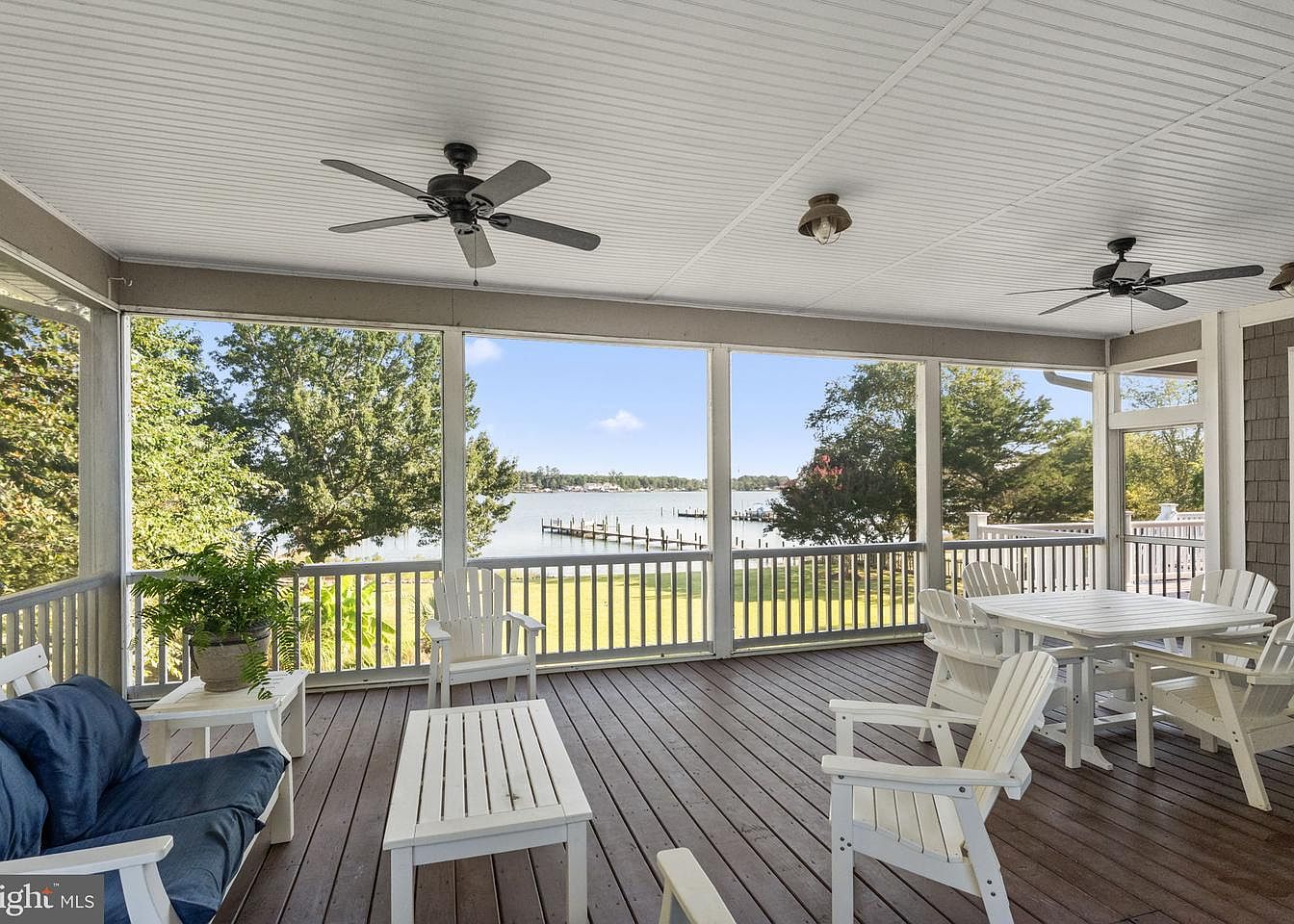 A spacious screened porch features large windows offering panoramic views of a serene waterfront, surrounded by lush greenery. The flooring is rich wooden planks, adding warmth to the space. White Adirondack chairs and a matching table create a relaxed atmosphere, perfect for gatherings. Ceiling fans enhance comfort, while natural light floods through the screens, complementing the light-colored walls and ceiling. A potted fern adds a touch of nature, seamlessly blending with the outside environment. This inviting area serves as a transitional space between indoor and outdoor living, ideal for both leisure and entertainment while enjoying scenic vistas.