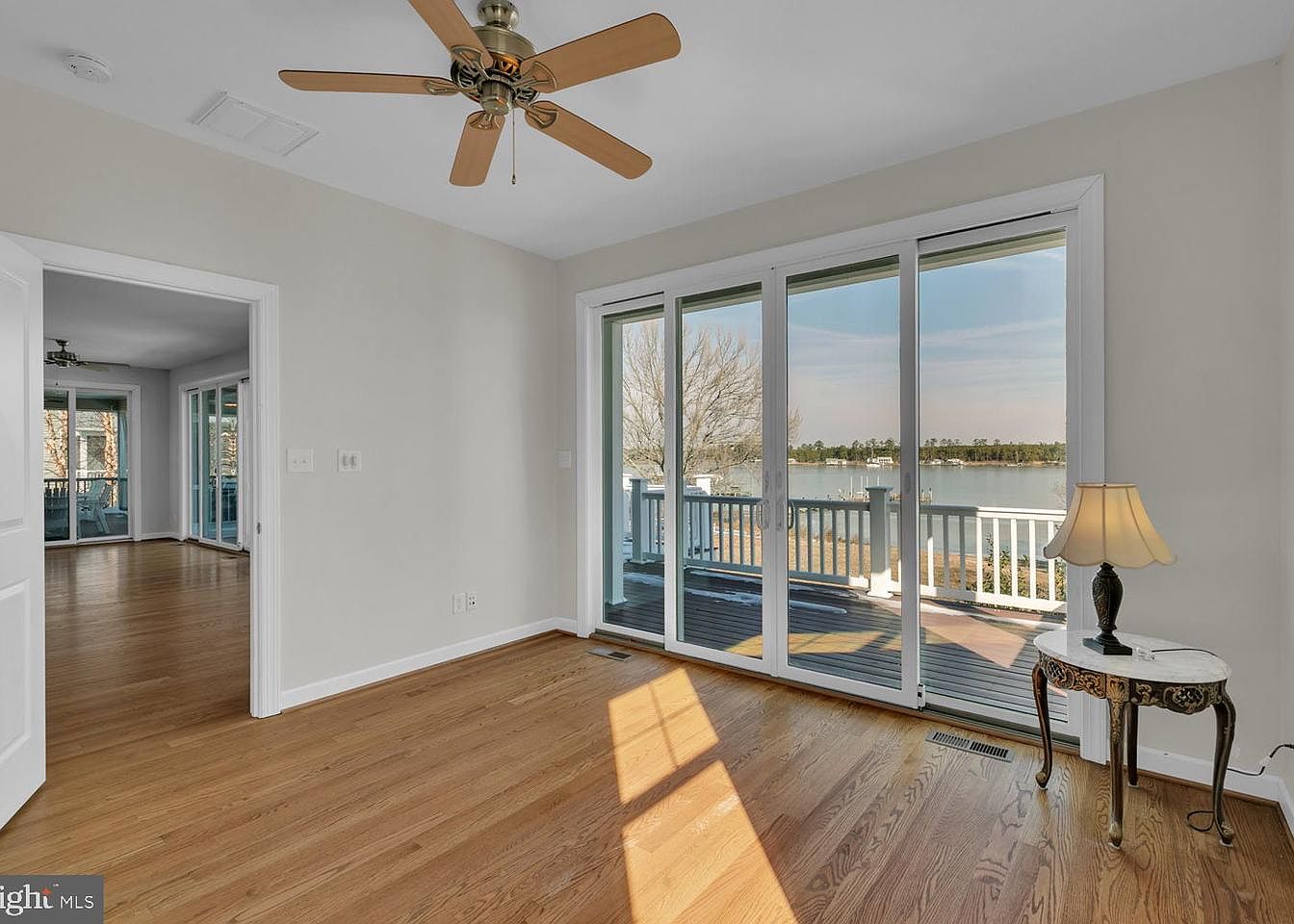 This sunroom features large glass sliding doors that open to a balcony overlooking a serene body of water. The light wooden flooring complements the neutral wall color, enhancing the airy feel. A traditional ceiling fan hangs above, providing a cozy touch. In the corner, a small round table with an elegant lamp adds an inviting detail. Natural light floods the room, creating a warm atmosphere while seamlessly connecting the indoors with the outdoor views. The overall aesthetic blends modernity with classic elements, making it a tranquil retreat for relaxation or leisure activities.
