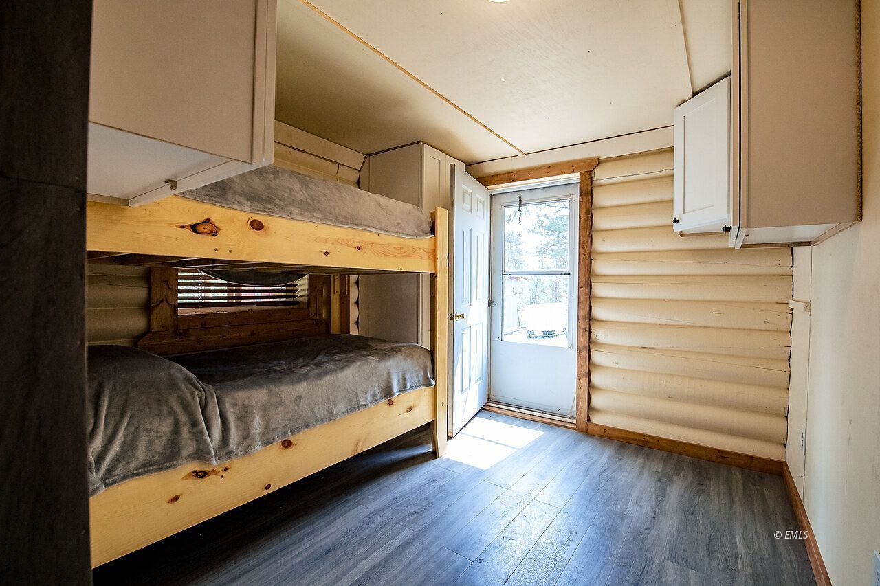 A cozy bedroom features sturdy wooden bunk beds with soft gray bedding, offering ideal accommodations for children or siblings. The warm tones of natural wood combine with log-style walls painted a gentle off-white, creating a rustic yet inviting atmosphere. Light pours in from the windowed back door, illuminating the rich, gray-toned flooring. Ample storage is provided by sleek white cabinets mounted on the walls, maximizing space and organization. A small wooden-framed window above the lower bunk invites more daylight, while the overall design blends comfort and practicality, making this room perfect for a growing family.