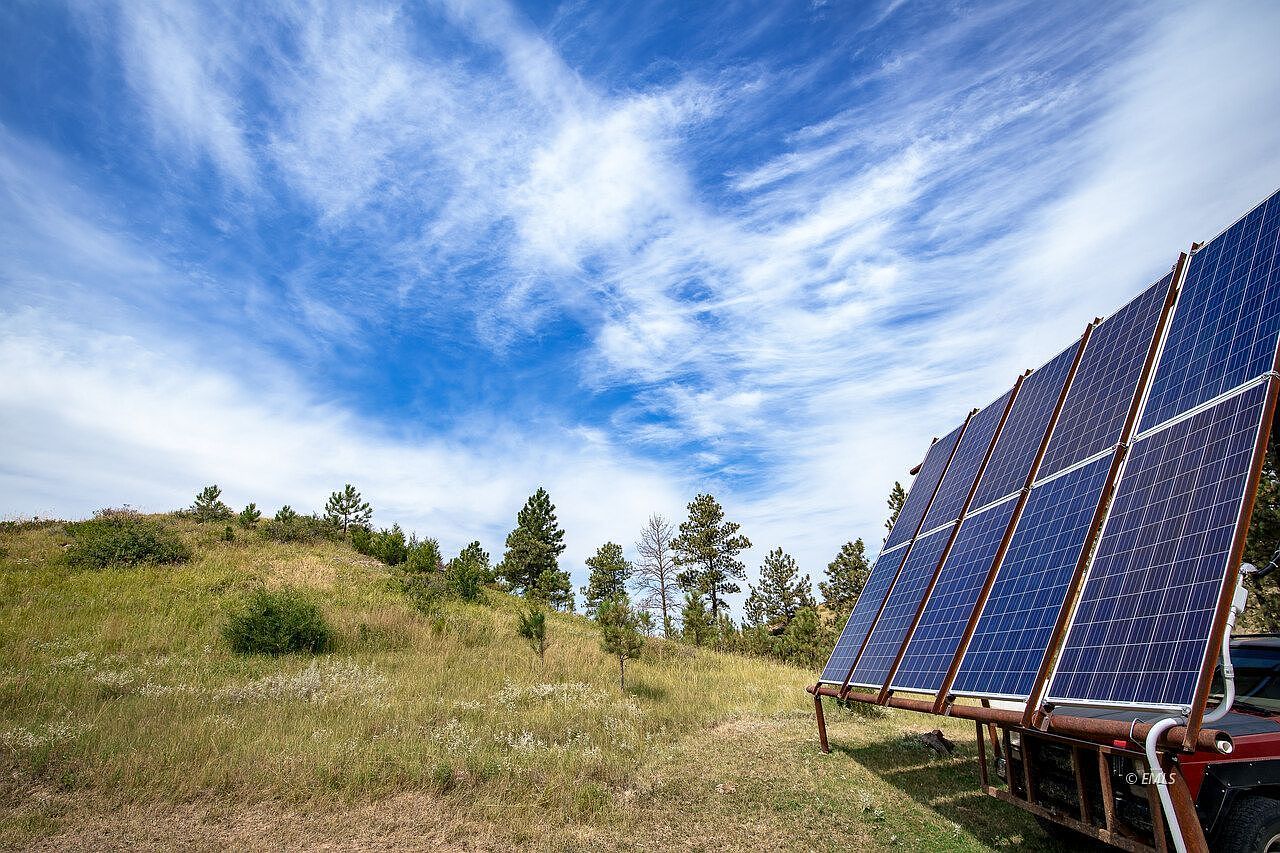 Expansive outdoor space featuring gently rolling grassy hills dotted with young pine trees, ideal for family activities and children’s play. The open land is bordered by taller trees, providing both shade and privacy, with plenty of room for building, gardening, or recreational use. Soft, natural earth tones dominate the color palette, ranging from golden-tan grasses to deep green pines, all beneath a vivid blue sky with wispy white clouds. Solar panels are visible on one side, suggesting sustainability and modern comforts. This yard encourages outdoor living, safe exploration, and enjoying nature in a serene, family-friendly environment.