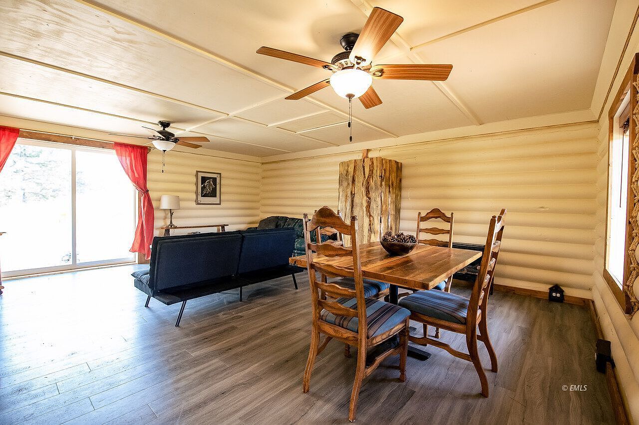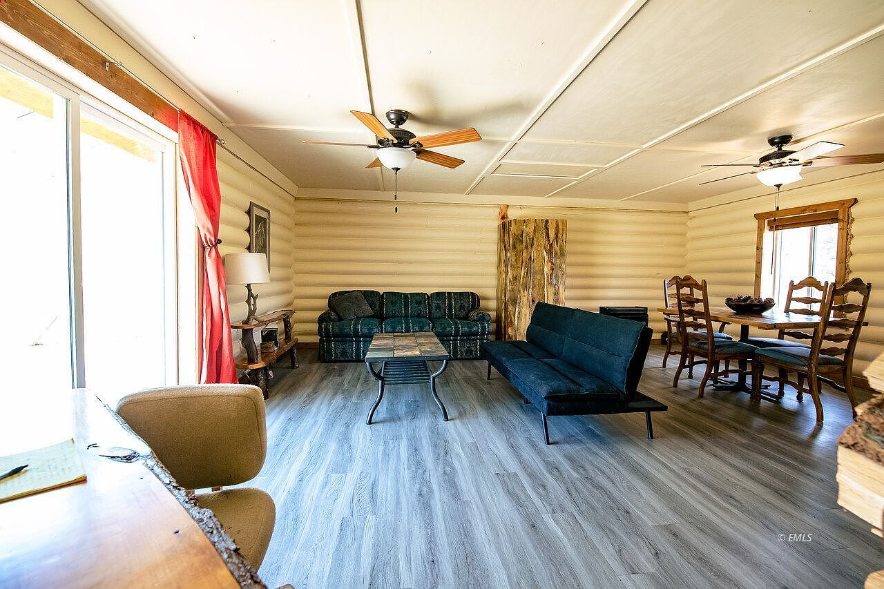 A warm, open-concept dining and living room features pale log-cabin walls and stylish hardwood flooring. The dining space is anchored by a rustic wooden table with four ladder-back chairs and a decorative centerpiece, perfect for family meals or gathering with friends. Adjacent to this, comfortable dark sofas form the living area, positioned near a picture window with bright red curtains, allowing natural light to flood the room. A unique wooden accent structure adds character, while two ceiling fans and neutral lighting keep the space inviting and family-friendly. The room’s blend of natural wood, soft tones, and spacious design encourages relaxation and conversation.