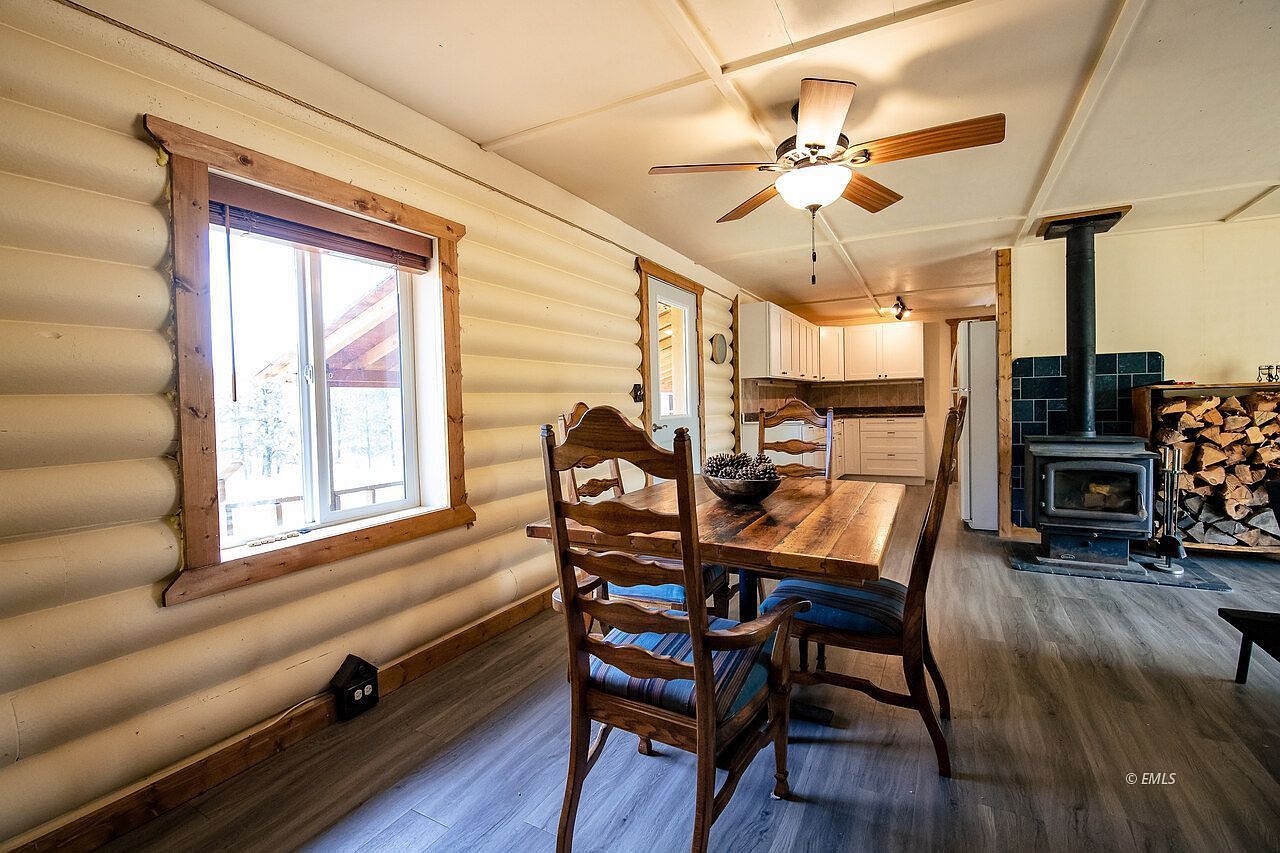 A cozy family dining space with rustic charm, this area features honey-colored log walls and natural wood trim around the large window, creating a warm atmosphere filled with natural light. A solid wood dining table with high-backed chairs sits at the room’s center, perfect for family meals or gatherings. The soft, muted gray flooring complements the earthy tones and ties the space together. In one corner, a classic wood-burning stove, surrounded by stacked firewood and dark tiles, offers both practical warmth and a comforting focal point. The open layout flows seamlessly into a bright kitchen with white cabinetry, ideal for family living.