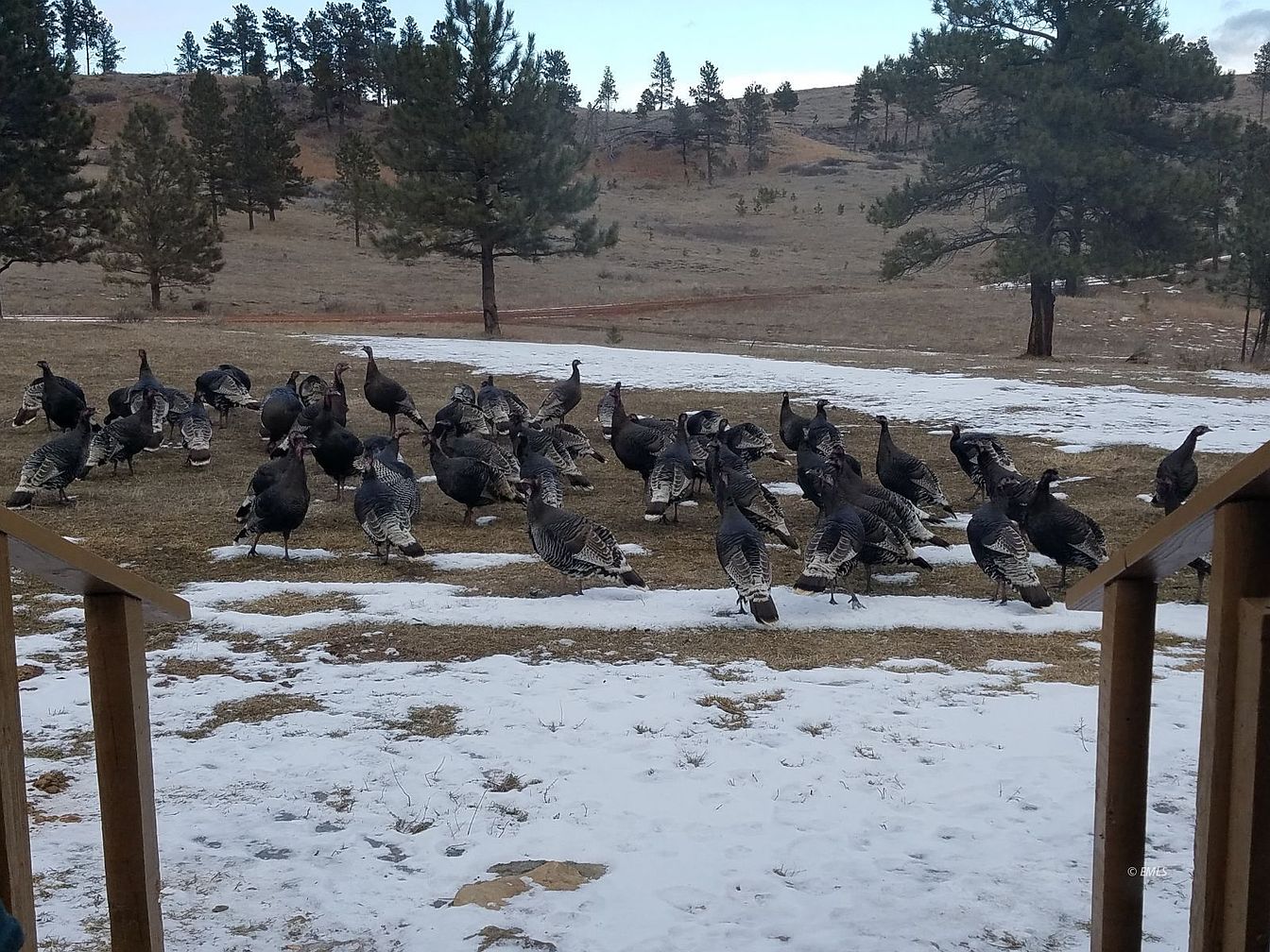 A spacious backyard unfolds just beyond the wooden railings of a porch or deck, facing open grass partially covered by patches of melting snow. The area is teeming with wild turkeys, providing a glimpse of the vibrant local wildlife and offering an exciting nature show for families, especially those with children. Rolling hills and scattered pine trees create a serene, natural backdrop under a clear sky, complementing the home’s rustic and tranquil atmosphere. The open, unfenced yard encourages outdoor play and family gatherings, while the unobstructed view of the landscape fosters a peaceful, inviting setting ideal for creating memories.