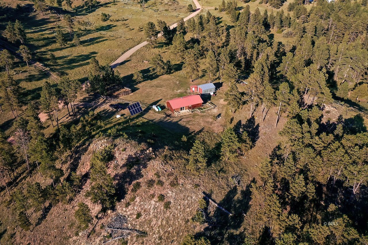 A picturesque aerial view of a rural family homestead nestled among lush trees and rolling hills, with a winding driveway leading to the property. The home has a red roof, surrounded by open green spaces perfect for children to play and families to explore. Outbuildings and solar panels are nearby, supporting sustainable living and practical storage. The landscape features both sunlit clearings and shaded areas provided by mature pine trees, creating a harmonious blend of natural beauty and privacy. The setting evokes tranquility, ample space, and a sense of safety ideal for a growing family seeking a peaceful retreat.