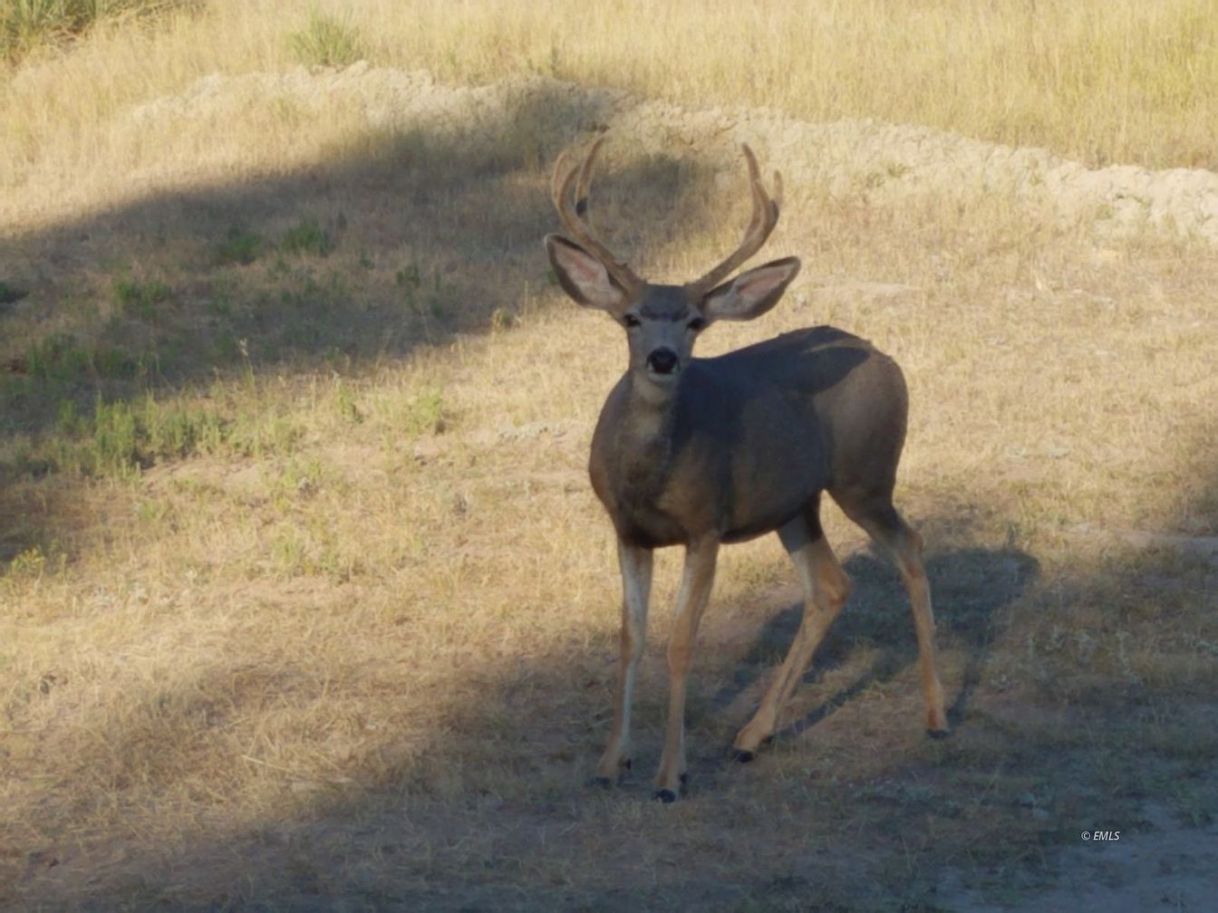 A serene backyard with natural dry grass and subtle greenery, spotted with a majestic deer standing in partial sunlight. The open area offers plenty of space for children to play and families to enjoy the outdoors, creating opportunities for nature watching right from home. The setting feels peaceful and blends seamlessly with the surrounding landscape, emphasizing a connection to nature. The environment is safe and unfenced, giving an expansive and inviting feel. Natural shades of tan, brown, and green dominate the color palette, evoking a calm and earthy atmosphere perfect for family relaxation and outdoor activities.