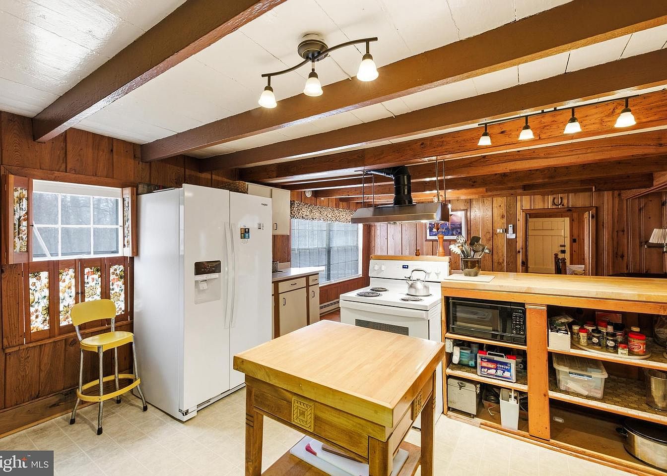 This cozy kitchen features wooden walls and beams, creating a warm, rustic atmosphere. The color scheme combines earthy browns with bright accents from the yellow bar stool and patterned window treatments. A white refrigerator stands next to a neatly organized countertop, which hosts a stovetop and microwave, all placed against natural wood cabinetry. In the center, a small wooden island serves as both workspace and dining area. Ample natural light floods the space through a window, complemented by stylish pendant lighting, ensuring the kitchen remains inviting and functional, perfect for cooking and gathering.