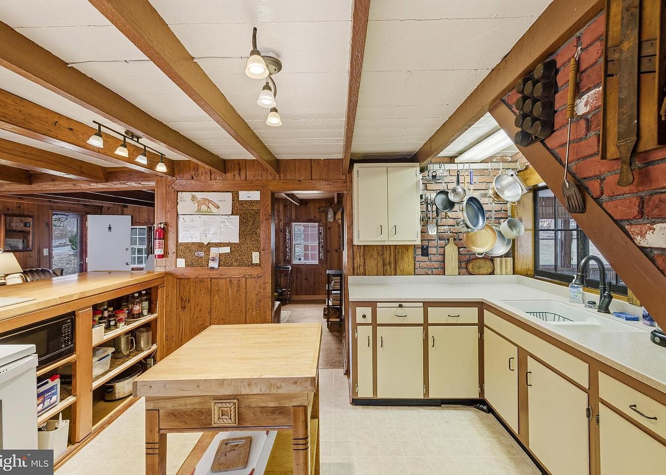 A cozy kitchen featuring rustic wooden beams and paneling, creating a warm, inviting atmosphere. The cabinetry is a soft cream with contrasting brown trim, complementing the natural wood accents. A central island crafted from light wood offers workspace and additional storage underneath. Hanging above, a variety of pots and utensils are organized on a bright brick wall, adding character and functionality. Natural light streams in from a window, illuminating the space and highlighting the clean countertops. The warm tones of the wood harmonize with the subtle beige floor, enhancing the kitchen’s charming farmhouse aesthetic.