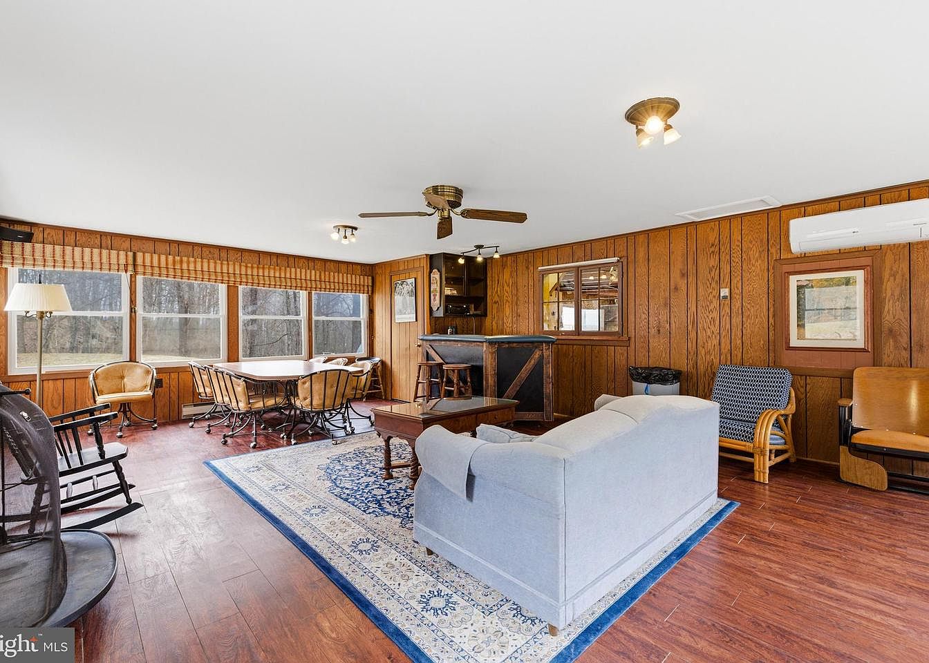 A spacious living room features warm wood paneling that adds a cozy ambiance, complemented by a large wooden table surrounded by circular, tan leather chairs with metal bases. Adjacent to the dining area, a light blue sofa offers comfort, sitting on a patterned blue and cream rug. A dark wooden coffee table stands near the sofa, contrasting the light flooring. Large windows allow natural light to pour in, framed by wooden blinds, while an exposed stone fireplace adds rustic charm. A ceiling fan circulates air, and wall-mounted art contributes personality to this inviting space.