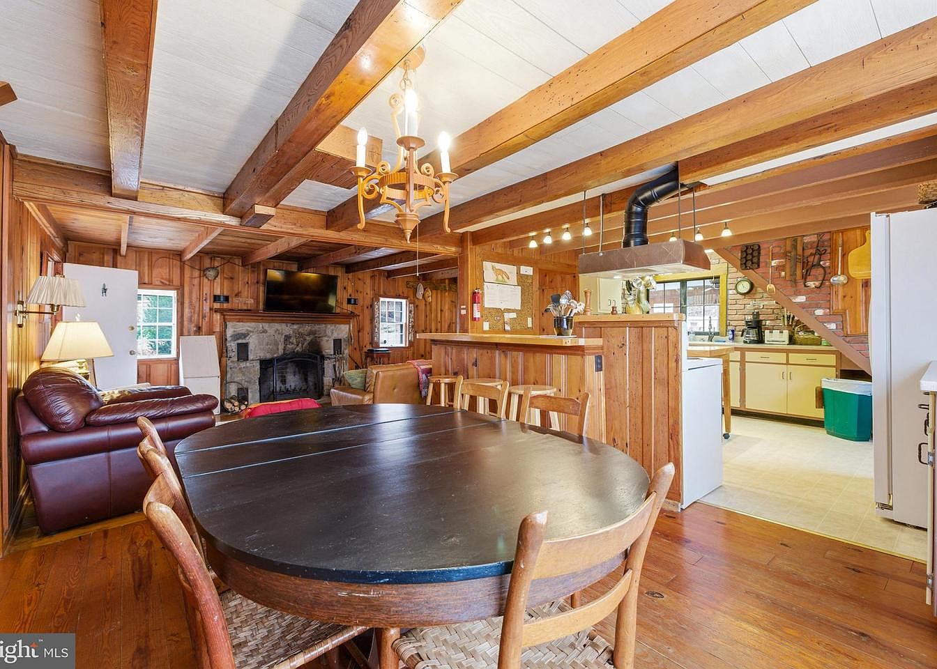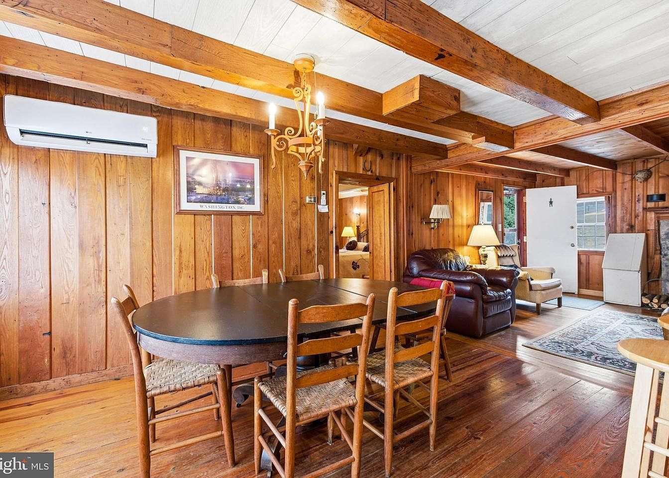 This cozy dining area features warm wooden paneling and exposed beams, creating a rustic charm. A circular black tabletop is surrounded by six wooden chairs with woven seats, fostering an inviting atmosphere. Soft lighting from an ornate chandelier illuminates the space, while a framed picture on the wall adds a personal touch. Adjacent to the dining table, a plush brown leather couch offers comfort, accentuated by a light-colored chair nearby. Natural light filters in from a large window, illuminating the rich tones of the wooden flooring. A charming area rug enhances the room’s warmth and texture.