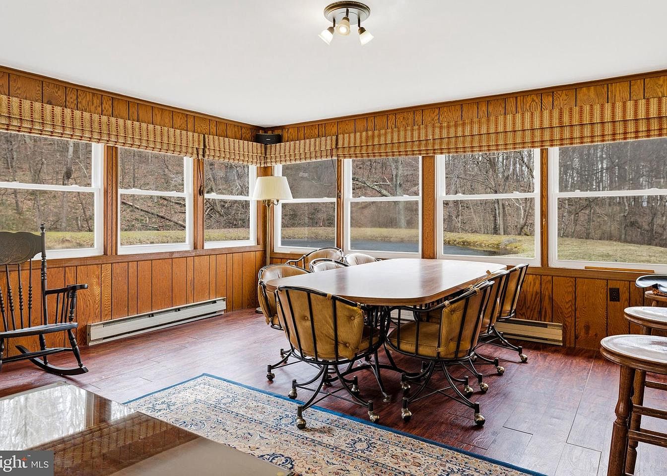 A sunroom featuring wood-paneled walls that exude warmth and character, complemented by expansive windows that provide abundant natural light. The room’s layout centers around a large, oval dining table surrounded by curved metal chairs with plush, tan cushions. A decorative rug with intricate designs adds a splash of color and texture beneath the table. To the left, a classic rocking chair invites relaxation, while a slender lamp offers additional lighting. The hardwood floor adds a rustic appeal, enhancing the cozy atmosphere. The view from the windows captures the serene outdoors, creating a perfect retreat for gatherings.