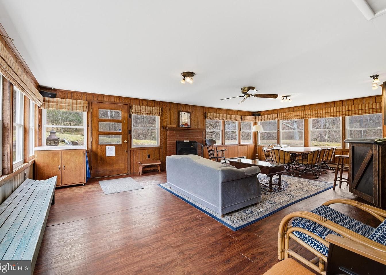The sunroom features warm wood paneling and large, multi-paned windows that allow natural light to stream in, enhancing the inviting atmosphere. A light-toned sofa sits atop a blue-patterned area rug, while a dark coffee table adds contrast. To the left, a sturdy wooden bench offers extra seating, complemented by a small side table and a decorative rocking chair. A dining table with mixed materials is positioned in the corner, facilitating gatherings. Soft, ambient lighting is provided by overhead fixtures and a nearby lamp, while a ceiling fan adds a functional touch to the overall rustic aesthetic.