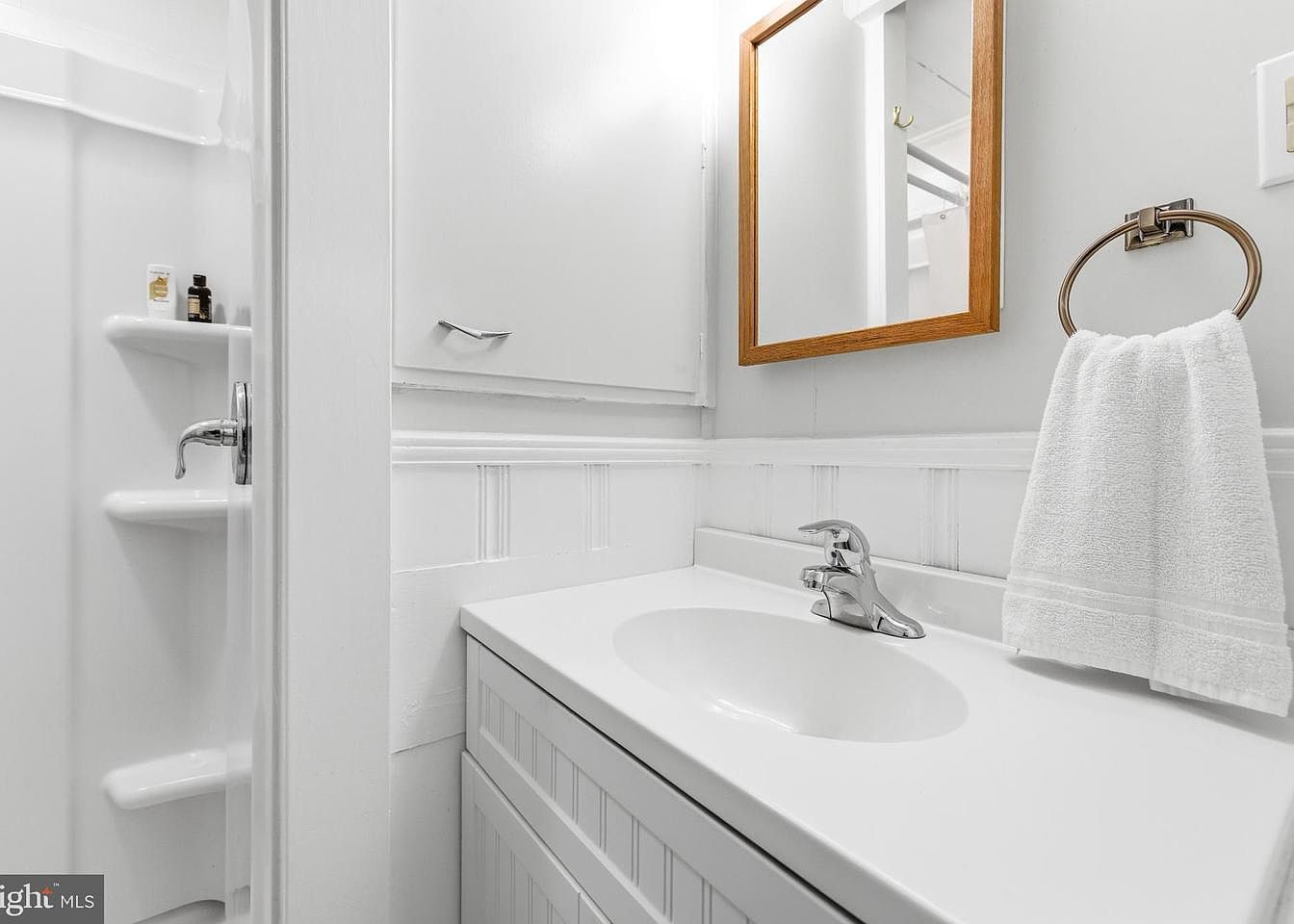 This compact bathroom features a clean and minimalist design, dominated by a bright white color scheme. The double sink vanity showcases a smooth countertop, paired with a chrome faucet that complements the contemporary aesthetics. Above, a framed mirror reflects natural light, enhancing the openness of the space. White wainscoting adds texture along the walls, contrasting with the sleek cabinetry that offers hidden storage. Adjacent to the vanity, a small shower encapsulated by a modern enclosure stands within easy reach, accessorized with built-in shelving for toiletries. A white towel hangs neatly on a polished chrome towel ring.