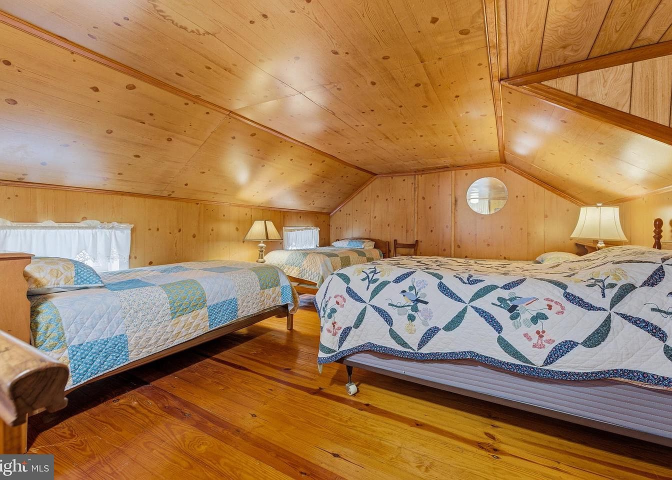 This cozy bedroom features warm wooden paneling and a sloped ceiling, showcasing a rustic charm. Two twin beds, each adorned with colorful patchwork quilts, create a welcoming atmosphere. A bedside lamp casts a soft glow, complemented by natural light filtering through lace curtains. The polished wooden floor adds character, while a circular mirror on one wall reflects the room’s cozy ambiance. A simple wooden chair sits beside one bed, enhancing the practical yet inviting design. The combination of textures and colors creates an intimate space, perfect for rest or conversation.