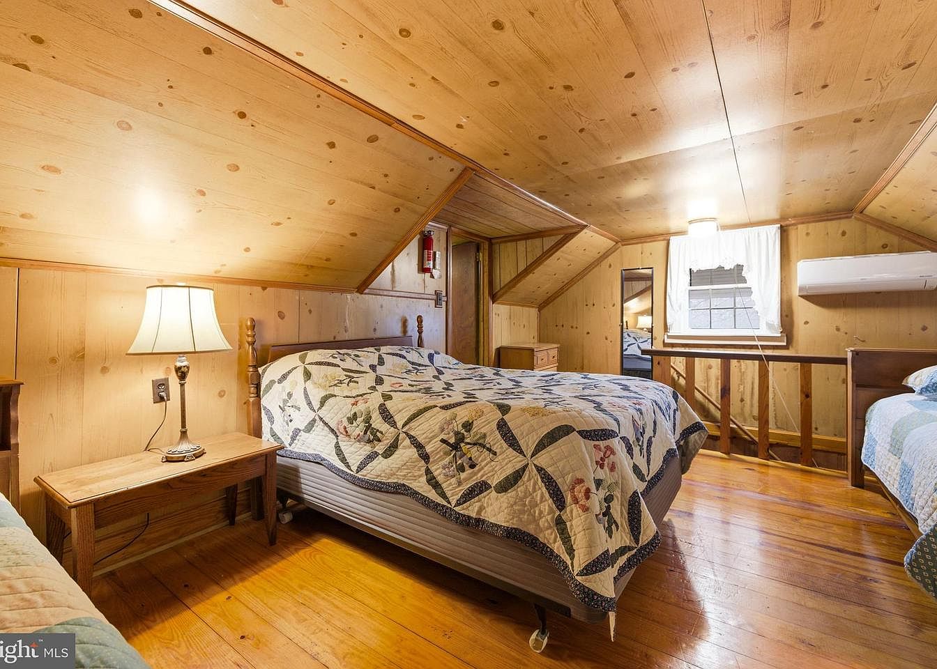 This cozy bedroom features a sloped wooden ceiling lined with warm pine paneling, creating an inviting atmosphere. Two beds are positioned opposite each other, both adorned with patterned quilts showcasing floral designs. A small wooden bedside table with a classic lamp offers soft lighting, enhancing the room’s charm. The flooring consists of polished wooden planks that add warmth. An old-fashioned dresser and a mirror reflect natural light from a window covered with sheer white curtains. An air conditioning unit is discreetly placed, ensuring comfort, while a fire extinguisher is mounted for safety. Rustic yet functional, this space balances comfort and practicality.