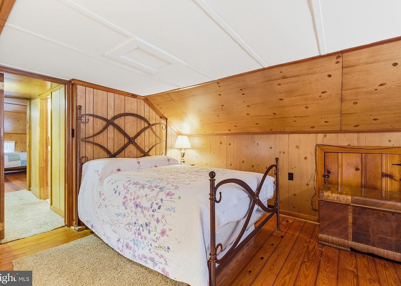Cozy attic bedroom features sloped wooden ceilings lined with natural wood planks, enhancing warmth and charm. A vintage iron bed, adorned with a floral quilt, is positioned strategically for comfort. Beside the bed, a classic bedside lamp provides soft illumination, creating a soothing ambiance. The room is anchored by a plush beige carpet, contrasting with the warm wooden tones. A wooden trunk sits at the foot of the bed, offering both storage and rustic style. An open doorway reveals additional living space, showcasing a maintained continuity of the wooden paneling present throughout the home.