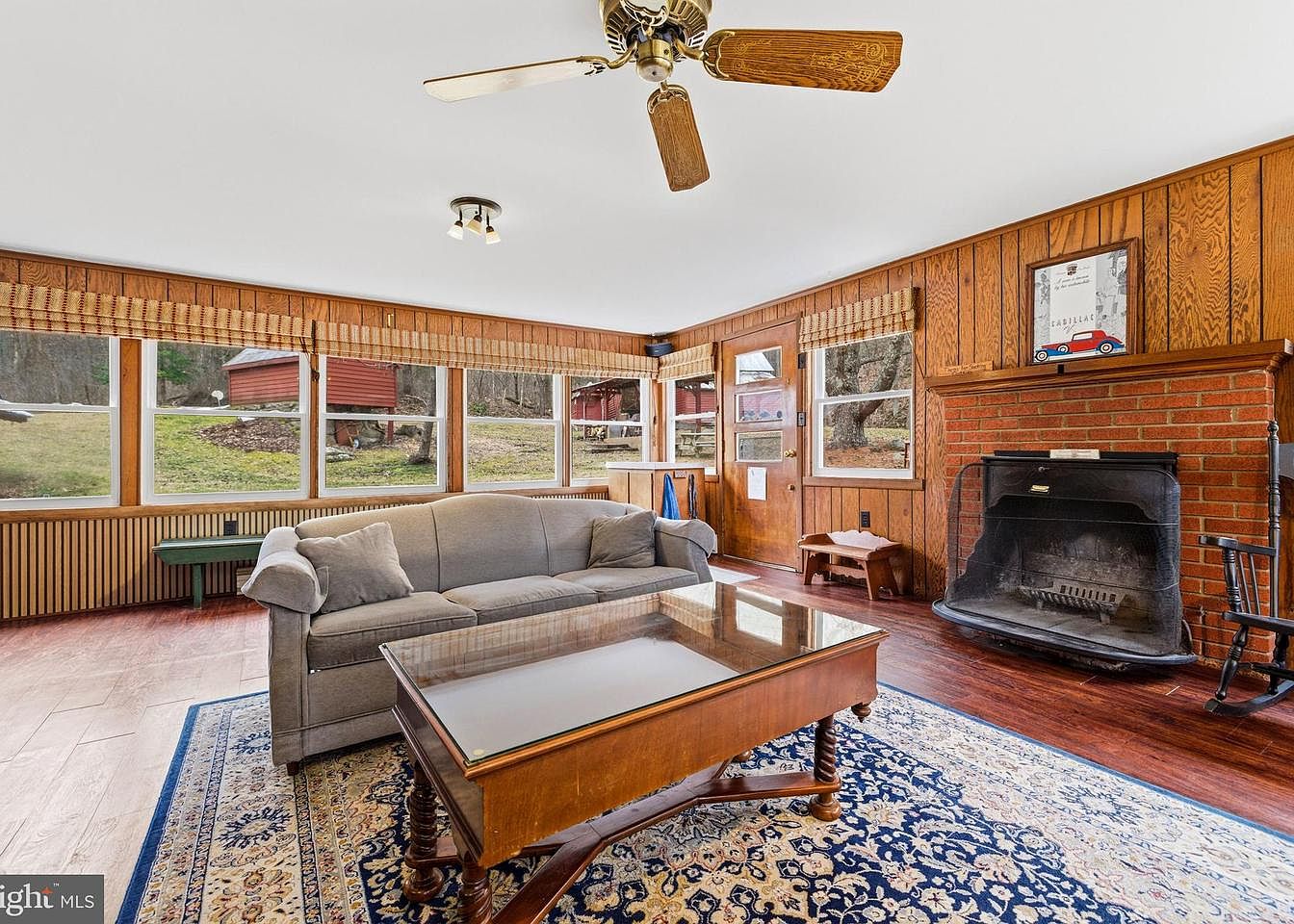 This cozy living room features a welcoming layout with large windows that bring in natural light and showcase a scenic view of the outdoors. The walls are adorned with warm wooden paneling and complemented by a classic brick fireplace, enhancing the rustic charm. A grey upholstered sofa, adorned with soft cushions, shares space with a stylish glass-top coffee table set on an intricately patterned area rug. Light hardwood floors underfoot provide a warm contrast. Decorative blinds frame the windows, while a ceiling fan adds to the room’s comfort, creating a relaxed atmosphere ideal for gatherings.