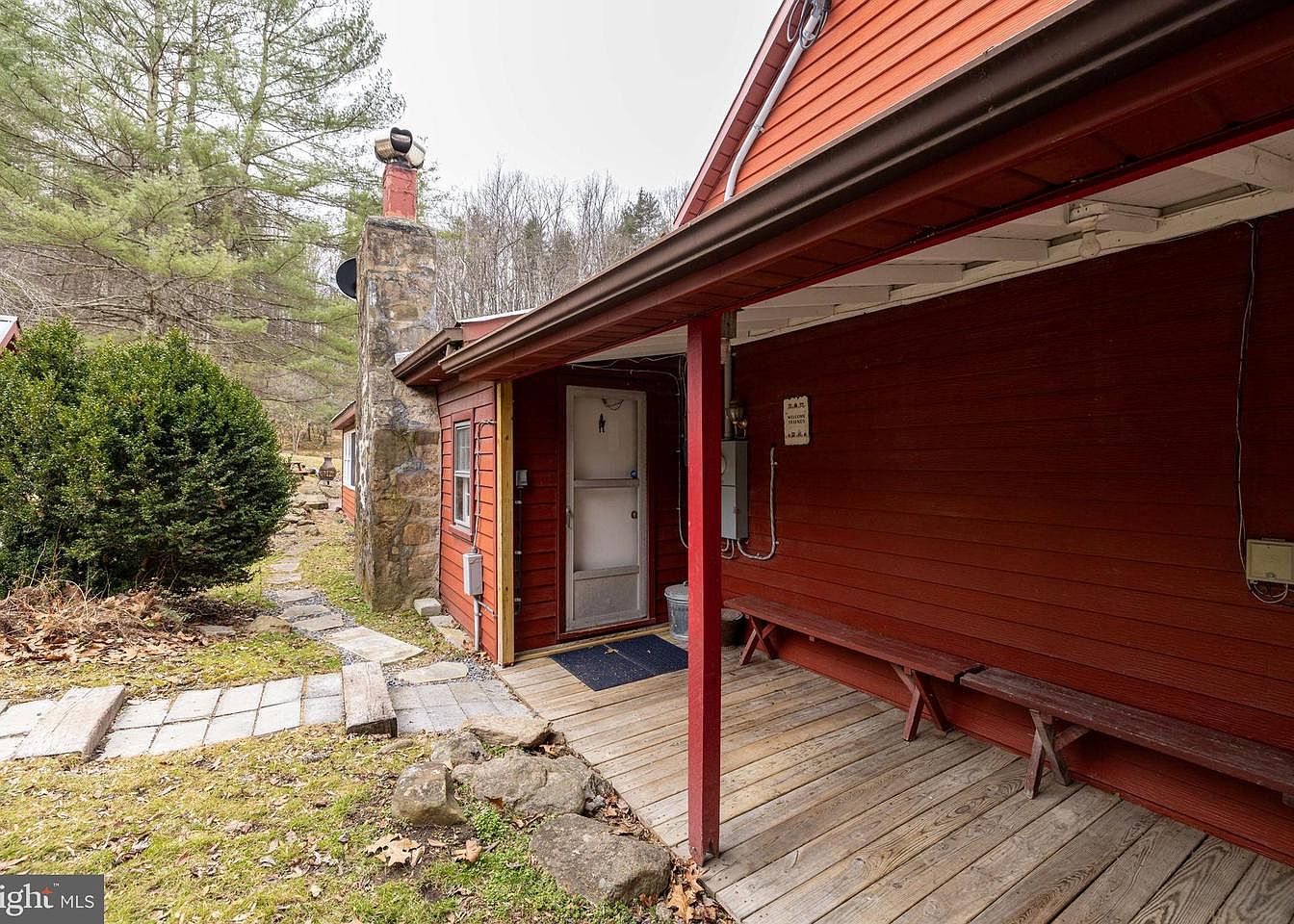 This front porch features a rustic charm with its natural wood flooring and red-stained wooden walls. A stone chimney rises prominently on one side, adding character and warmth. The design incorporates a small seating area with wooden benches, perfect for relaxation. A partially covered roof provides shelter, while the adjacent pathway of stone slabs leads to the garden, inviting nature inside. Lush greenery surrounds the area, enhancing the outdoor appeal. The overall aesthetic is cozy and inviting, blending traditional elements with a touch of natural beauty, making it an ideal spot for enjoying the outdoors.