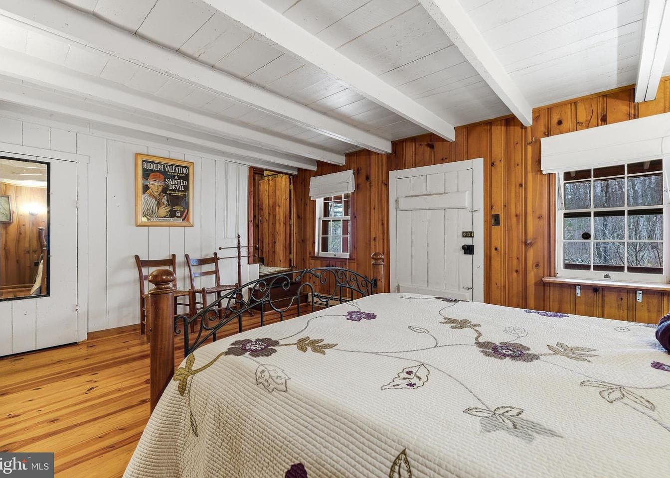 This cozy bedroom features a rustic ambiance with warm wooden walls and ceiling beams painted white for contrast. The flooring showcases natural wood planks, enhancing the room’s warmth. A wrought-iron bed with a floral quilt takes center stage, adding a touch of softness and color. To the left, a mirror reveals the reflection of wooden chairs, ideal for seating. Natural light filters through the window, highlighting the charming details of the wooden structure. The simplicity of the décor, complemented by vintage artwork on the wall, creates an inviting and tranquil atmosphere, perfect for rest and relaxation.