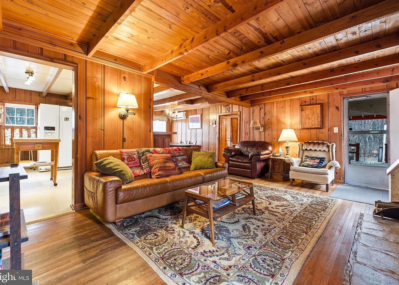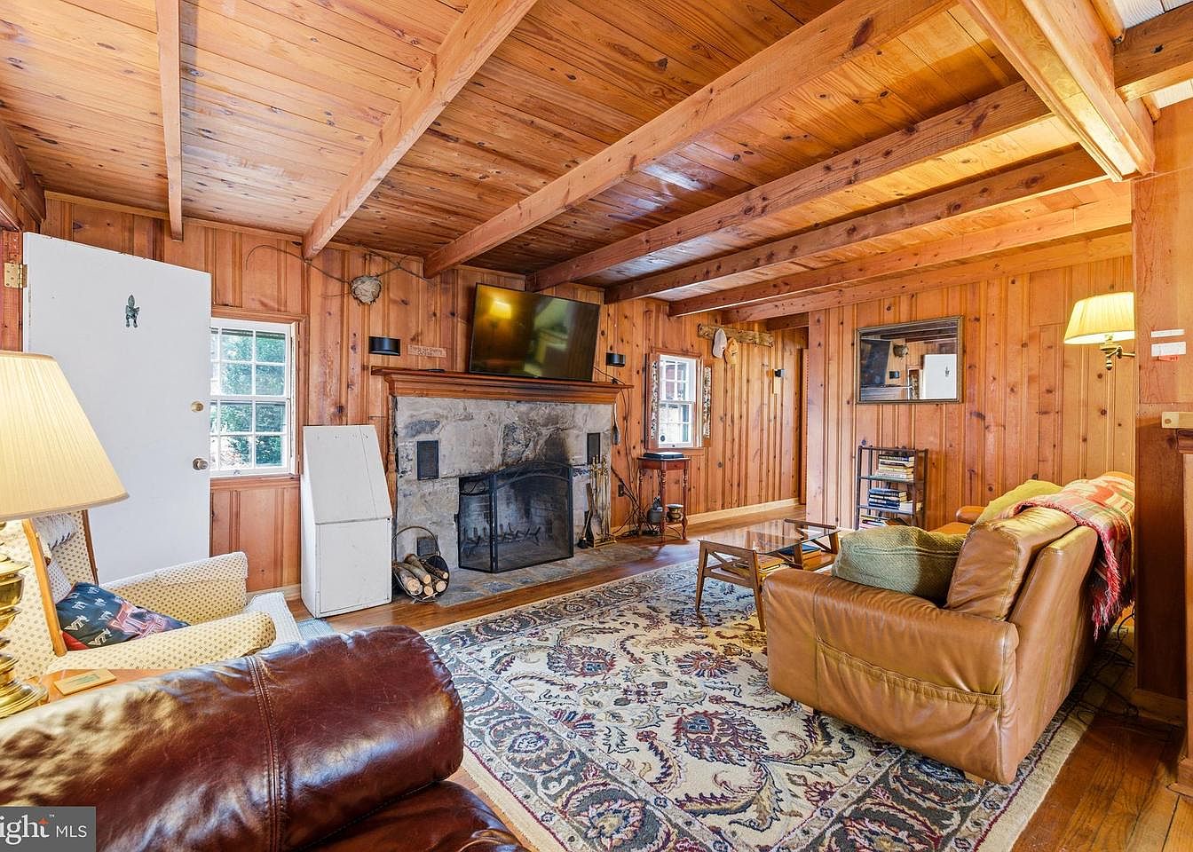 This cozy living room features rich wooden paneling and exposed beams that create a warm ambiance. A plush brown leather sofa is adorned with colorful throw pillows, offering comfort. A glass-top coffee table stands on a vintage, intricately patterned area rug, enhancing the space’s charm. The focal point is a stone fireplace, complete with a decorative screen and surrounded by rustic accessories, evoking a sense of homeliness. Natural light flows through a window beside the fireplace, illuminating the room, while a door leads to the outside, suggesting a connection with nature.