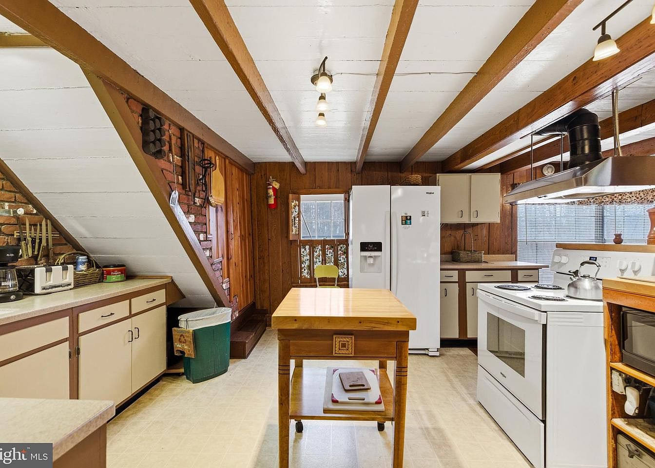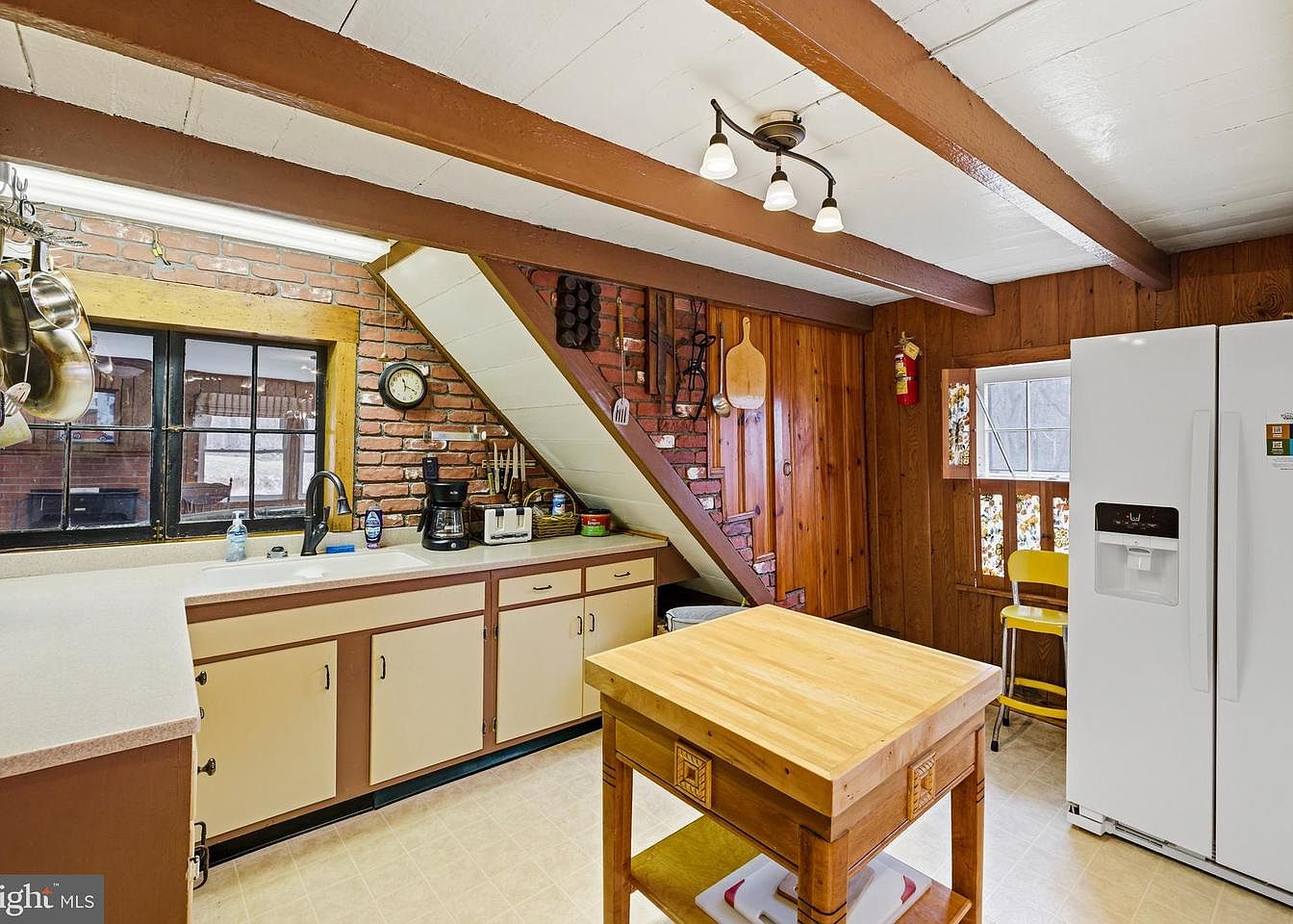 This kitchen showcases a charming blend of rustic and functional design. Exposed wooden beams and a warm brown color scheme add character, while brick walls provide a textured backdrop. Cream-colored cabinets contrast with the dark countertops, creating a welcoming atmosphere. A wooden preparation island stands centrally, enhancing work space. A large, white refrigerator and various kitchen appliances are smartly integrated along one wall. Natural light floods through the window, illuminating the space, while decorative items, such as hanging pots and a vintage clock, contribute to the home’s historic charm. A cozy, inviting feel permeates this cooking area.
