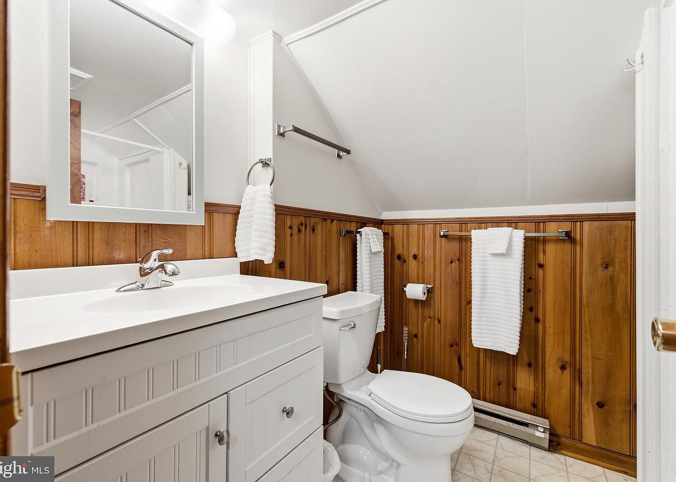 A compact bathroom featuring warm wooden paneling halfway up the wall, contrasting with pristine white above. The layout includes a sleek white vanity with horizontal grooves, topped with a smooth sink and polished chrome faucet. A large, framed mirror enhances light reflection, supported by modern wall-mounted lighting. To the right, a white toilet integrates seamlessly into the design, paired with neatly stacked white towels on a chrome rack. The floor is adorned with light-colored tile, offering a clean and spacious feel, while the angled ceiling above adds a charming dimension to the cozy atmosphere.