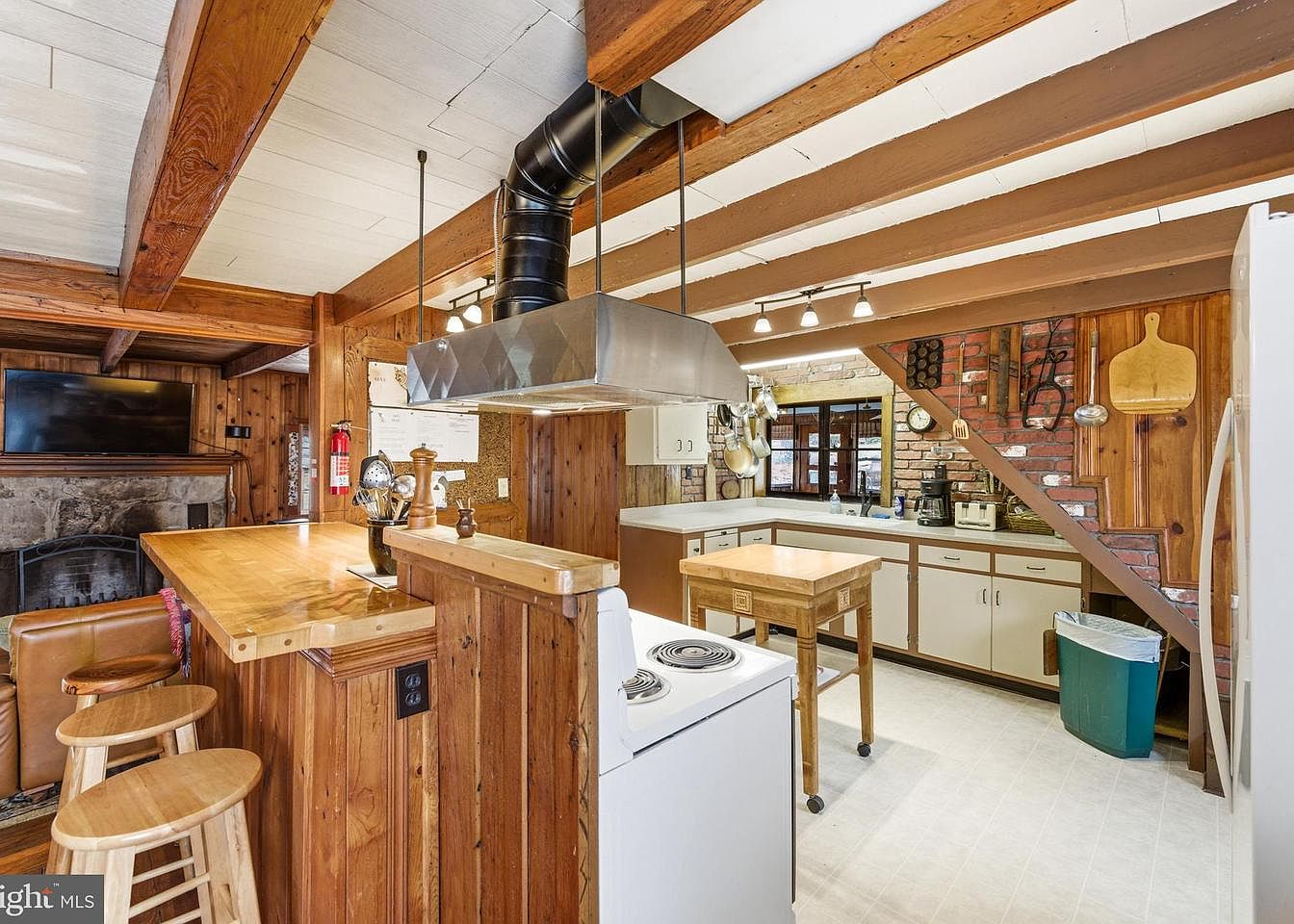 This cozy kitchen showcases warm wood tones throughout, featuring exposed wooden beams and richly stained cabinetry. A central island with a wooden countertop serves as a functional workspace. Modern stainless-steel appliances contrast with the rustic elements, including a classic range hood above the stove. The backsplash combines brick and a wall of hooks, displaying cooking utensils, enhancing the charm. Seating is provided by three wooden stools positioned against the bar area. Warm lighting from overhead fixtures complements the intimate atmosphere, while a cozy fireplace adds warmth and enhances the homely feel of this inviting space.
