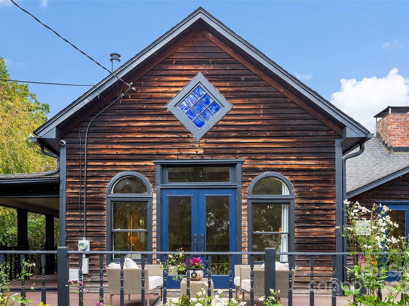 The front porch features a classic façade with dark-stained wooden siding and sharp, clean lines. Three sets of tall, arched windows and blue French doors with glass panes dominate the structure, inviting sunlight into the house. A unique square stained-glass window, set at a diagonal in the gable, adds an artistic touch above the entry. Outdoor wicker armchairs with plush light cushions are arranged facing each other, creating a cozy seating area. The porch railing is simple and dark-hued, with flowering plants and greenery at the edges, all beneath a clear blue sky and surrounded by mature trees.