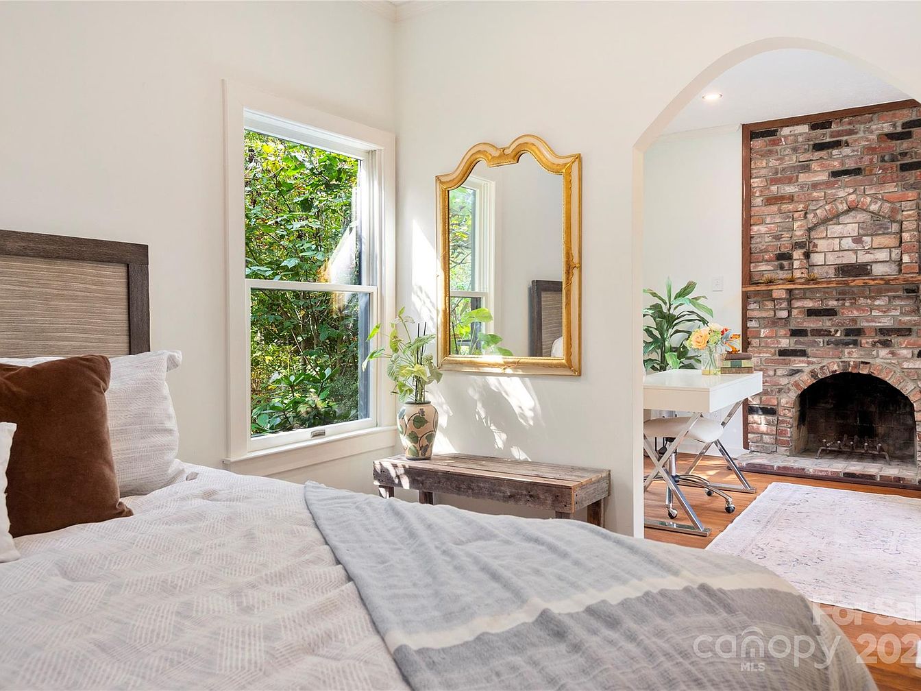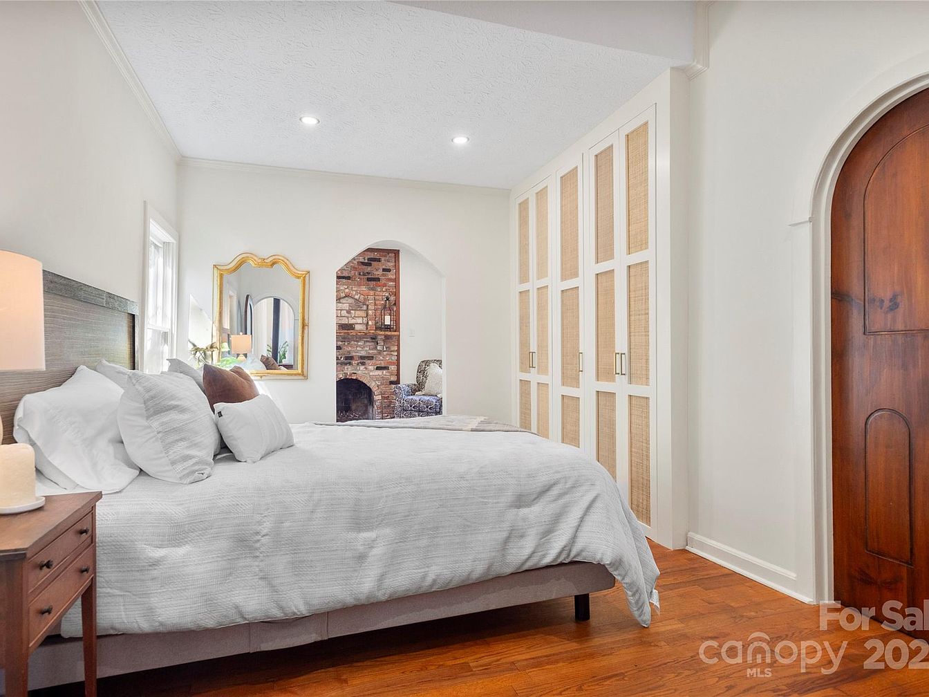 A cozy bedroom features warm hardwood floors and cream-colored walls, creating a soothing atmosphere. The bed is dressed in soft white linens and accented with multiple plush pillows. A wooden nightstand with a small lamp sits beside the bed. Built-in closets with woven panel detailing line one wall, offering both storage and texture. A graceful arched wooden door adds historic charm, while an arched opening on the far wall leads to a sitting area with exposed brick and a classic fireplace. A gold-framed mirror above a small window brings added light and elegance to the room.
