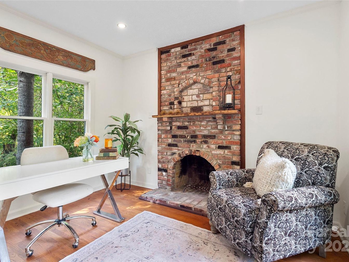 A cozy corner of the house features a small workspace set against large windows that usher in natural light and provide a view of lush greenery outside. The desk is minimalistic and modern, topped with fresh flowers, candles, and books, paired with a white office chair. Dominating one wall is a rustic exposed brick fireplace with a uniquely arched opening and wooden mantle, decorated with a lantern candle. Nearby, a plush patterned armchair with a chunky white knit pillow offers a comfortable reading nook. The space combines crisp white walls with warm-toned hardwood floors, balancing vintage charm and contemporary clarity.