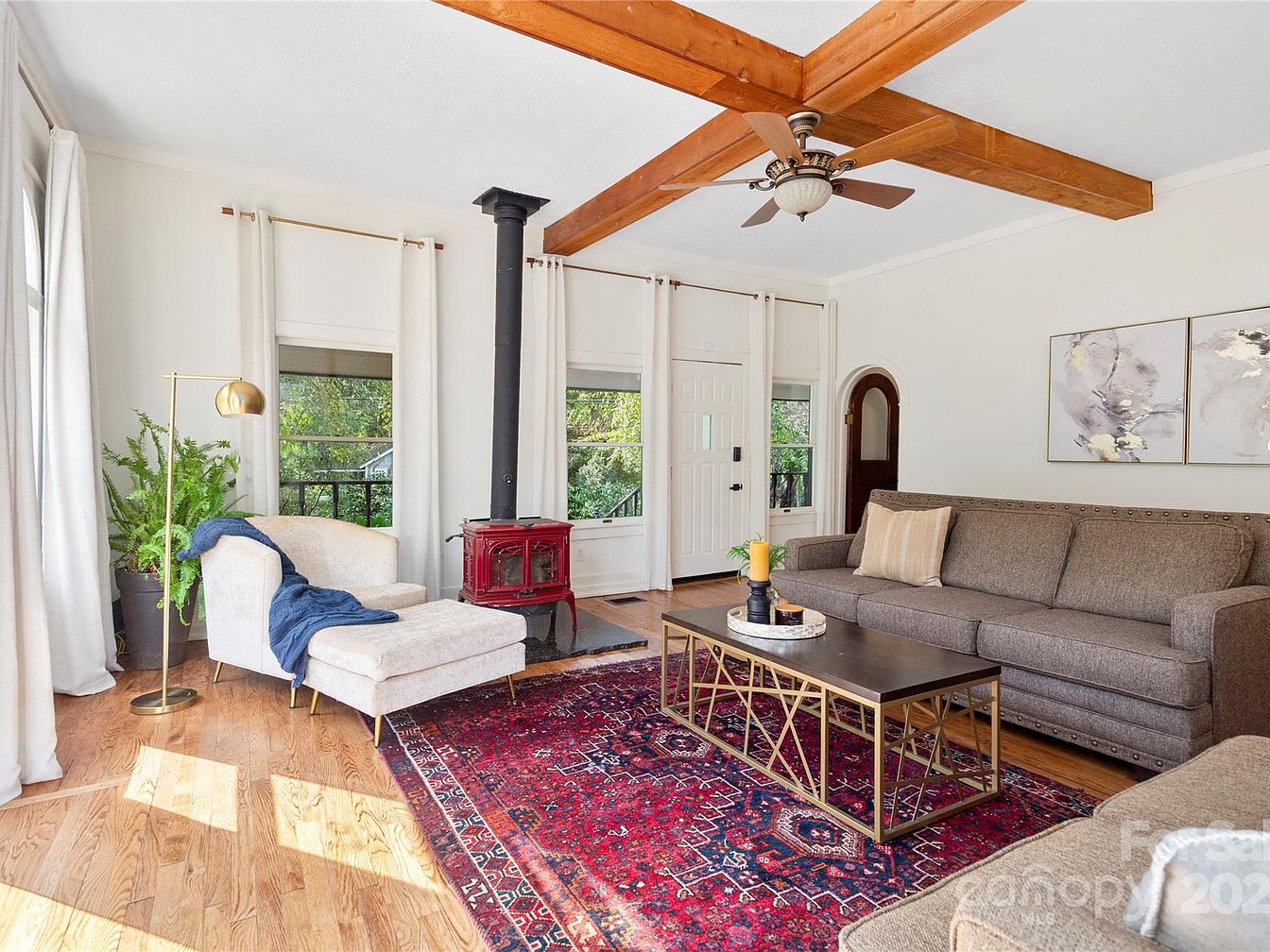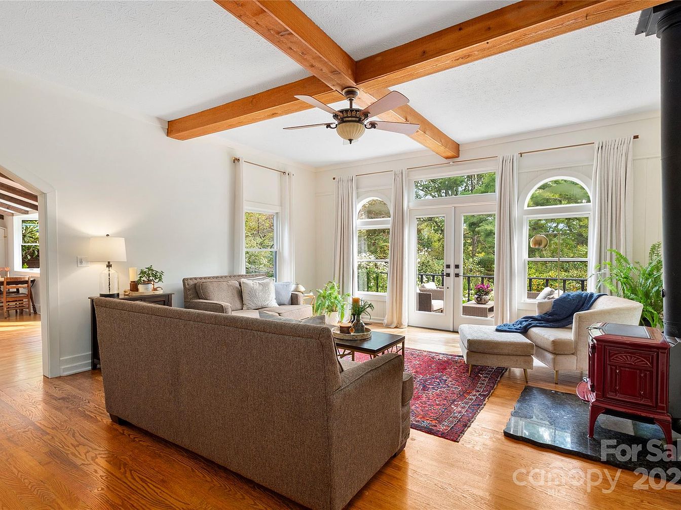 A bright and inviting living room features warm hardwood floors, exposed wood ceiling beams, and large windows with arched transoms letting in abundant natural light. French doors open to a lush green garden, enhancing the airy ambiance. Neutral-colored sofas and a coordinating ottoman create a cozy seating area atop a deep red Persian-style rug. The space is accented with houseplants and a vintage red wood stove resting on a black slate hearth. Light cream walls and sheer floor-length curtains establish a soft, tranquil backdrop while a traditional ceiling fan completes the harmonious blend of classic and modern touches.