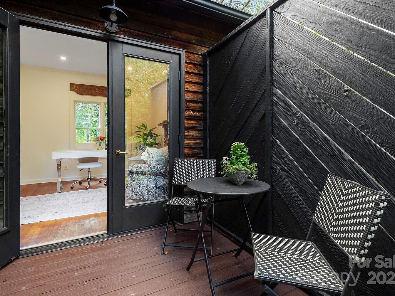 A small, intimate patio features two black and white woven chairs and a round black table with a potted plant centerpiece. The space is enclosed by chevron-patterned, jet-black wooden privacy fencing and overlooks a rustic exterior wall with dark siding. Double glass doors open into a bright room with cream walls, a white desk, a rolling office chair, and warm wood floors. The patio’s earthy deck contrasts with the modern monochrome furniture. Overhead, a black metal sconce adds understated lighting, blending industrial and natural styles to create a cozy outdoor nook for relaxing or working.