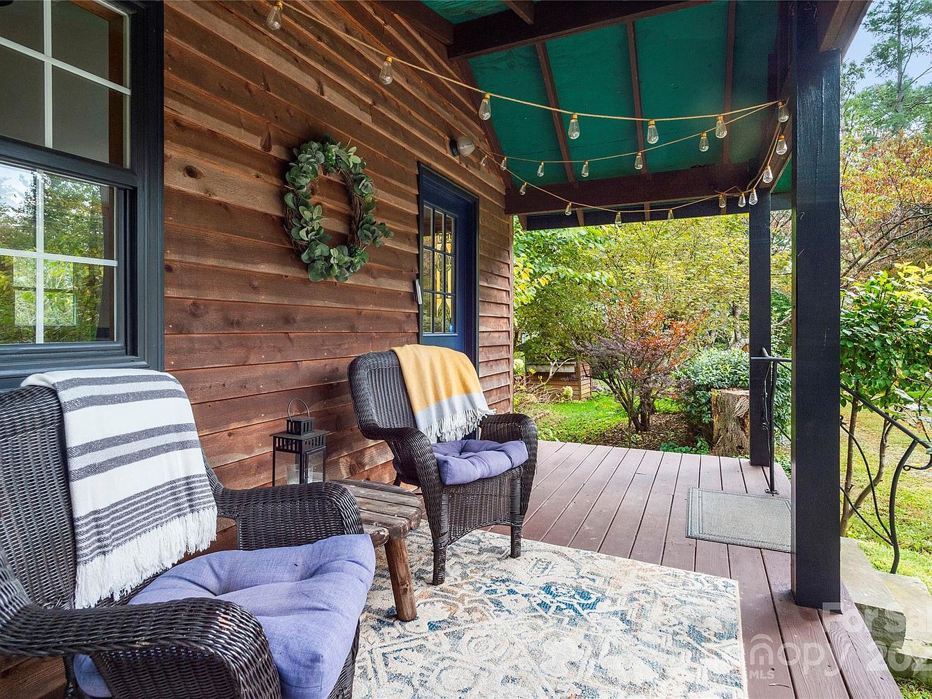 A charming front porch shaded by a deep green metal roof and surrounded by lush trees and bushes. The exterior features dark wooden siding with contrasting black trim around the window and door. A cozy rattan armchair with a pillow and throw is set beside a rustic wood stump side table, creating a welcoming sitting area. String lights hang just below the roofline, adding a touch of warmth and whimsy. Potted plants and small shrubs line the steps and base, blending the home naturally into the vibrant greenery of the landscape. The scene feels inviting and serene, ideal for quiet outdoor relaxation.