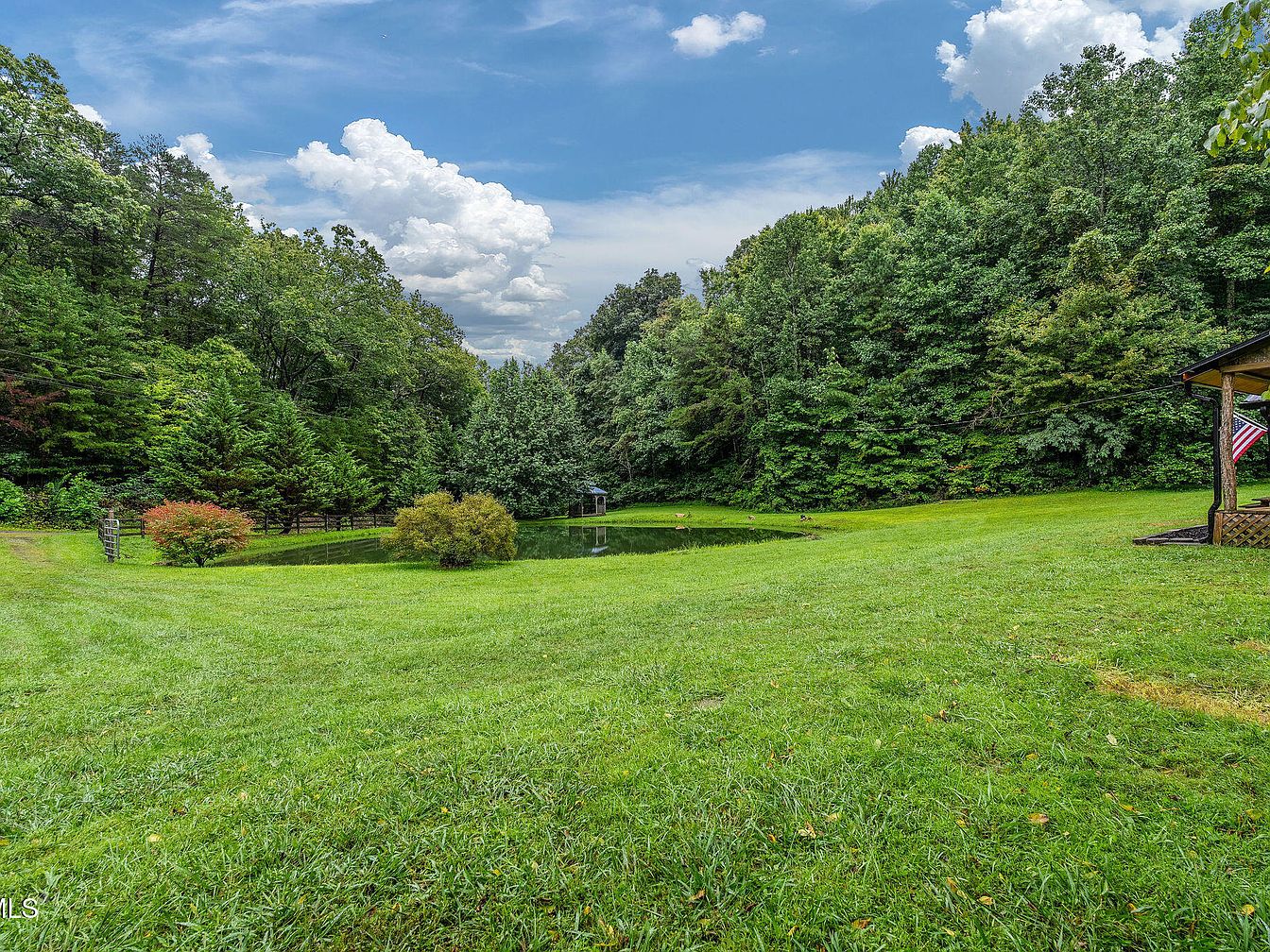 A spacious and lush backyard stretches across rolling green lawns, framed by dense woodlands and gentle hills. At the heart of this private outdoor escape is a serene pond, bordered by neatly trimmed grass and scattered ornamental shrubbery. Towering trees encircle the open area, providing natural shade and creating a sense of tranquility and seclusion. A rustic cabin and outbuilding sit nestled among the trees, offering practical space for gatherings or storage. Plenty of open lawn space encourages safe play for children and pets, while wide views of mountains and sky amplify the peaceful, family-friendly rural atmosphere.