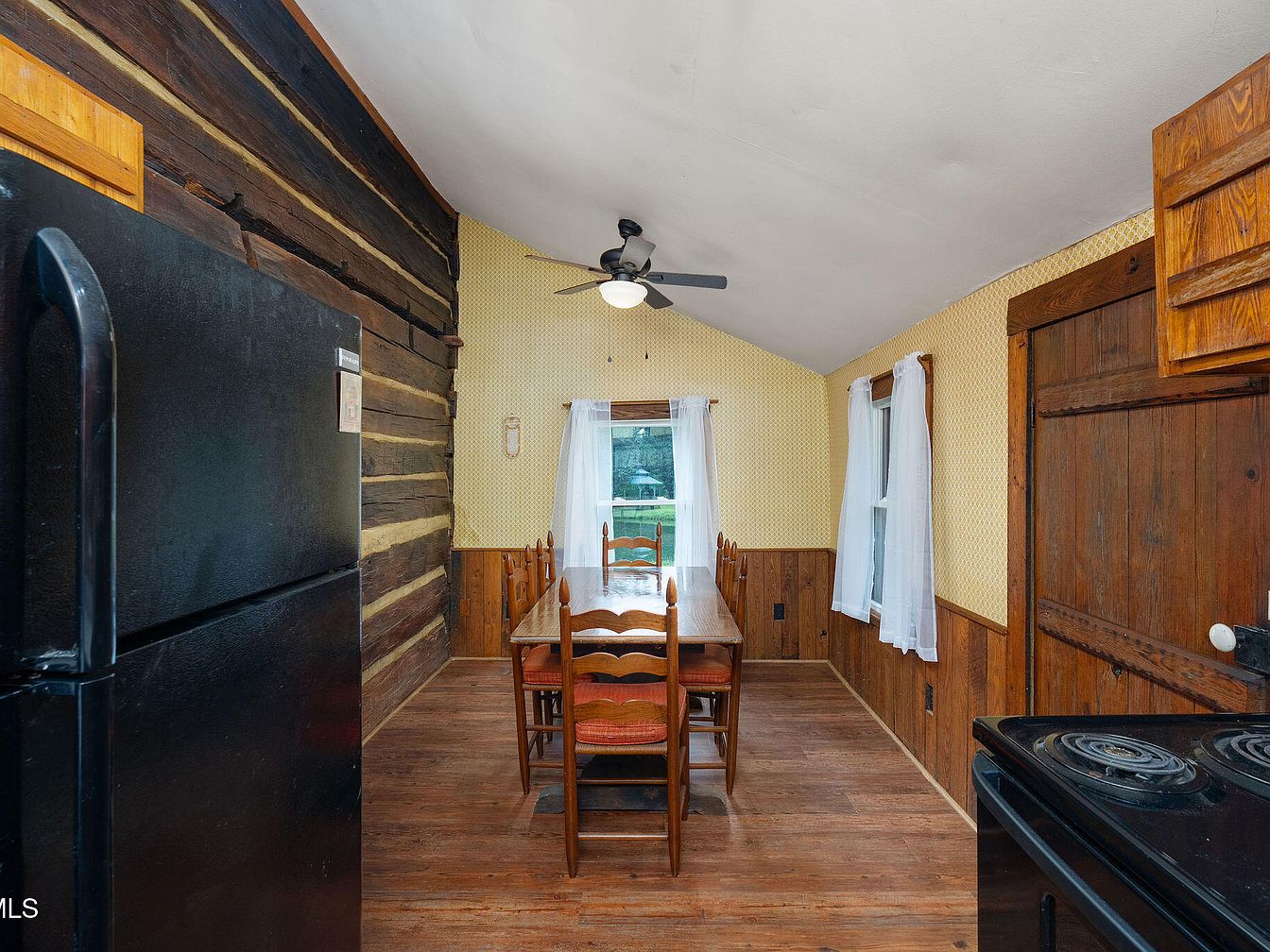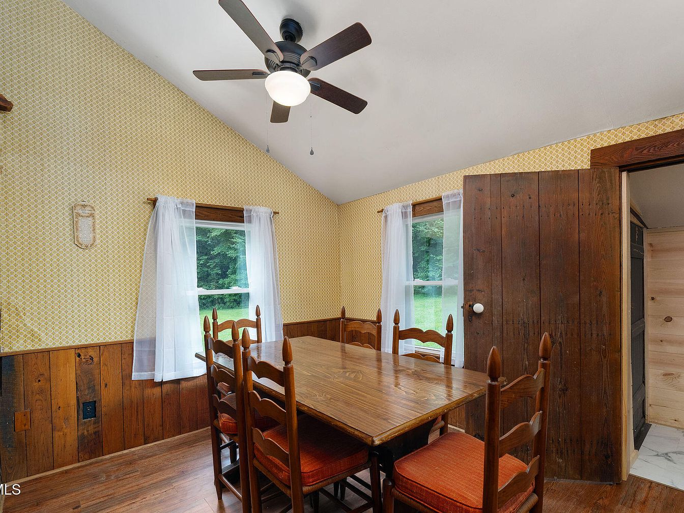 Warm and welcoming, this dining area combines rustic log cabin charm with a practical family layout. The room features wood-paneled walls with one side showcasing exposed log beams and the others covered in golden yellow wallpaper above classic wainscoting. A sturdy wooden dining table, surrounded by six high-back chairs, sits in the center beneath a ceiling fan and light fixture. Natural light streams in through three windows adorned with sheer white curtains, creating a bright, airy atmosphere. The woodgrain flooring ties together with the cabinetry and doors, making this space perfect for everyday family meals and gatherings.