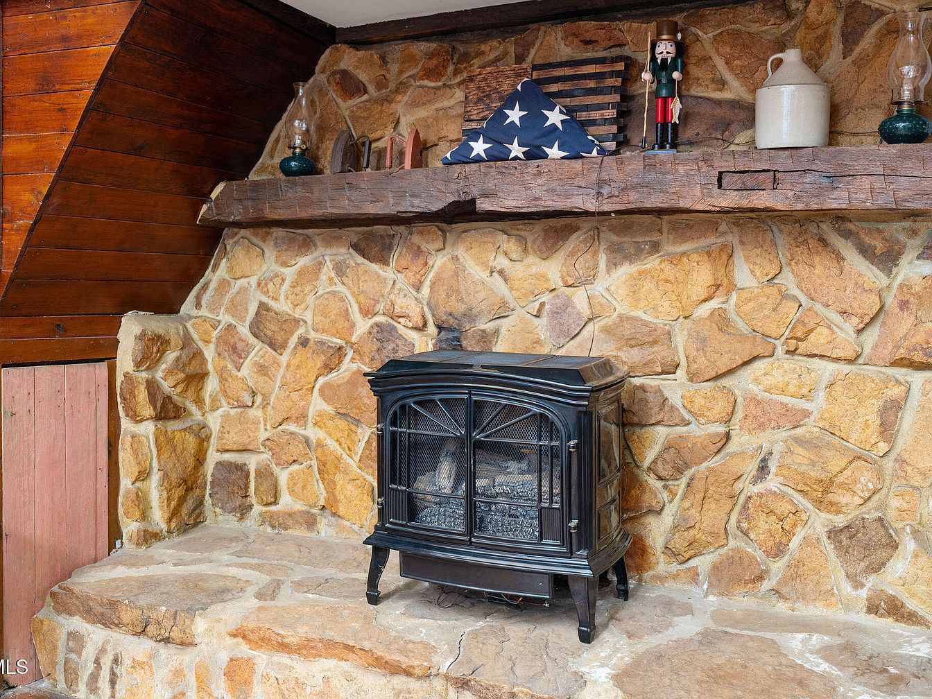 Warm and inviting, this fireplace nook features a rustic stone wall and hearth that extends fully underfoot, creating a cozy corner perfect for gathering. The black cast iron stove sits centrally, offering both function and classic charm. Above the fireplace, a hefty wooden mantel displays a folded American flag, a wooden nutcracker, decorative oil lamps, vintage pottery, and a wooden accent, adding character and a sense of history. Rich, dark wood paneling on the side angles contribute to a cabin-like feel. This nook provides a safe, hearth-centered spot for family relaxation and memorable evenings together.