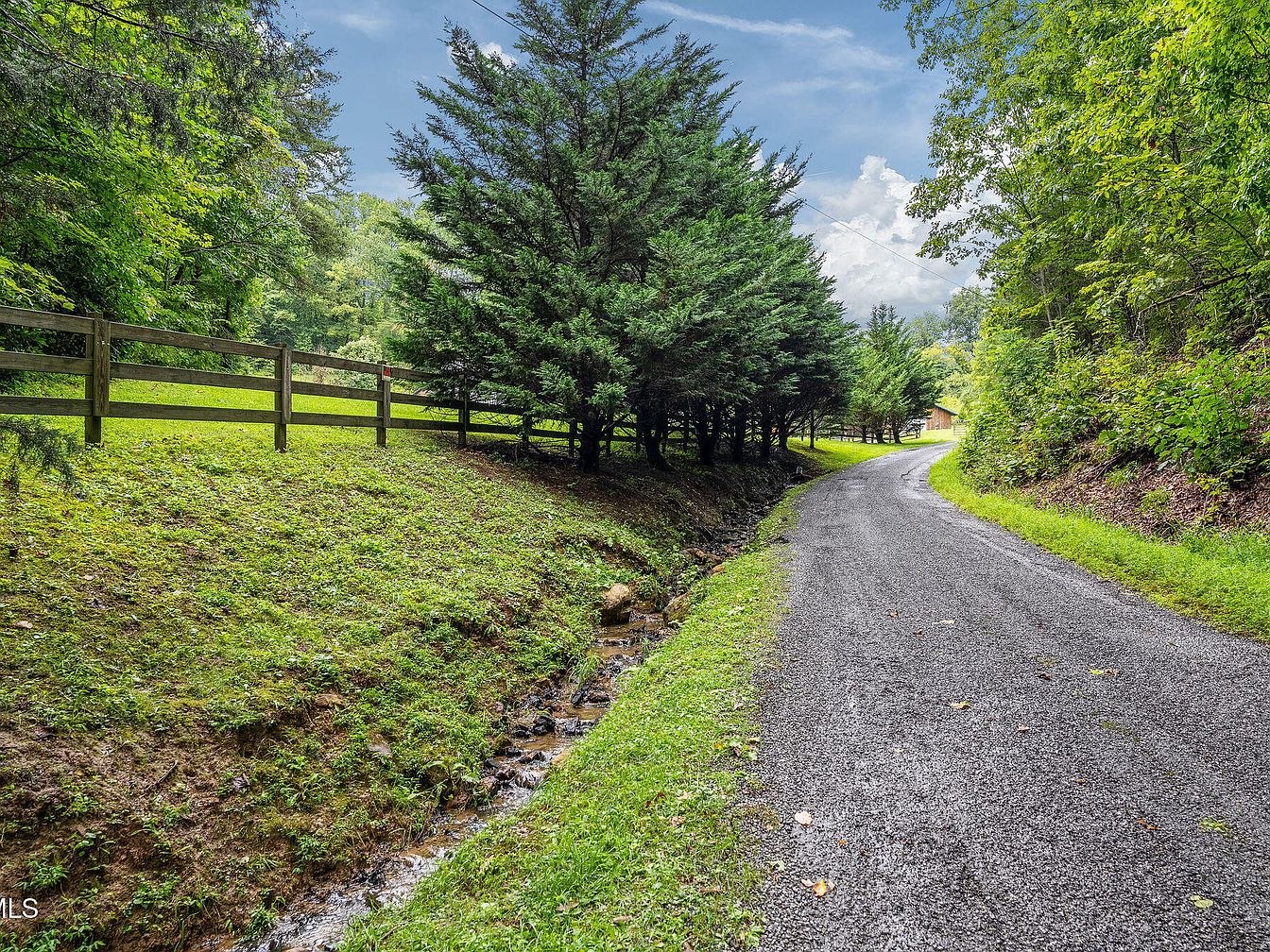 A long, gently winding gravel driveway leads towards the home, bordered by a beautiful split-rail wooden fence on the left and a dense cluster of evergreens, creating a natural privacy screen. Lush green grass and vibrant leafy trees line both sides, providing a serene and inviting approach for families and guests alike. A shallow stream runs alongside the drive, adding a soothing element and space for playful exploration. The open, well-maintained surroundings offer a sense of safety for children and ample opportunity for outdoor family activities in a peaceful, nature-filled setting with plenty of greenery and fresh air.