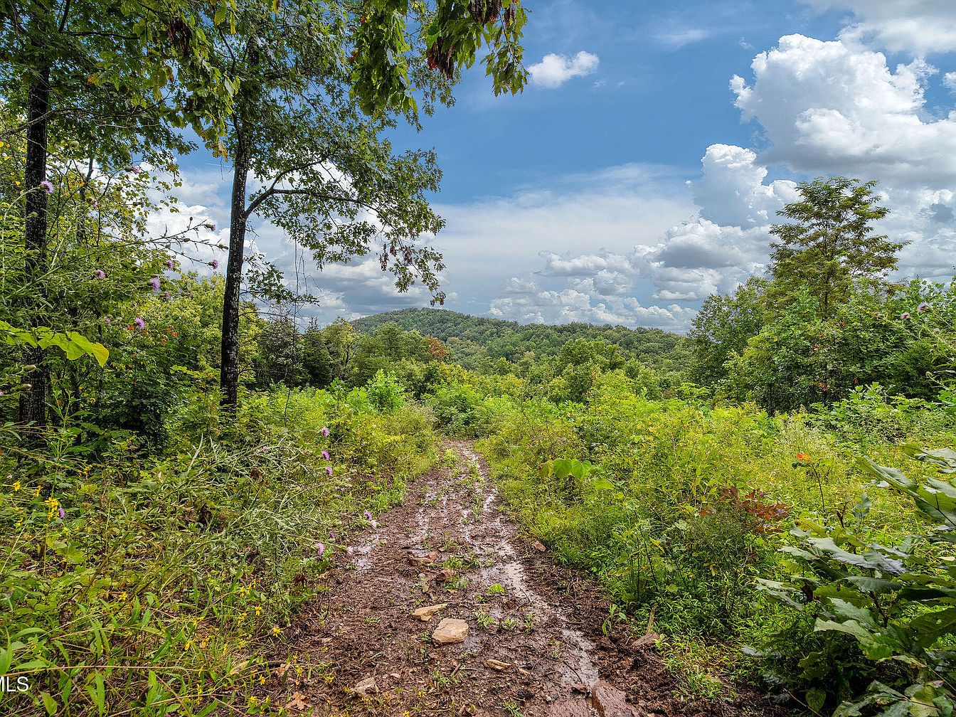 A scenic backyard trail winds through lush greenery, bordered by tall trees and vibrant wildflowers. The earthy, muddy path leads the eye toward a gentle hill in the distance, framed by a stunning horizon of rolling forest. The landscape offers a perfect spot for children to explore nature or families to enjoy hikes and outdoor activities together. The surrounding foliage is a lively mix of fresh greens with pops of purple and yellow blooms. The open sky, peppered with fluffy white clouds, enhances the feeling of tranquility and spaciousness, making this space ideal for family adventures and peaceful outdoor moments.