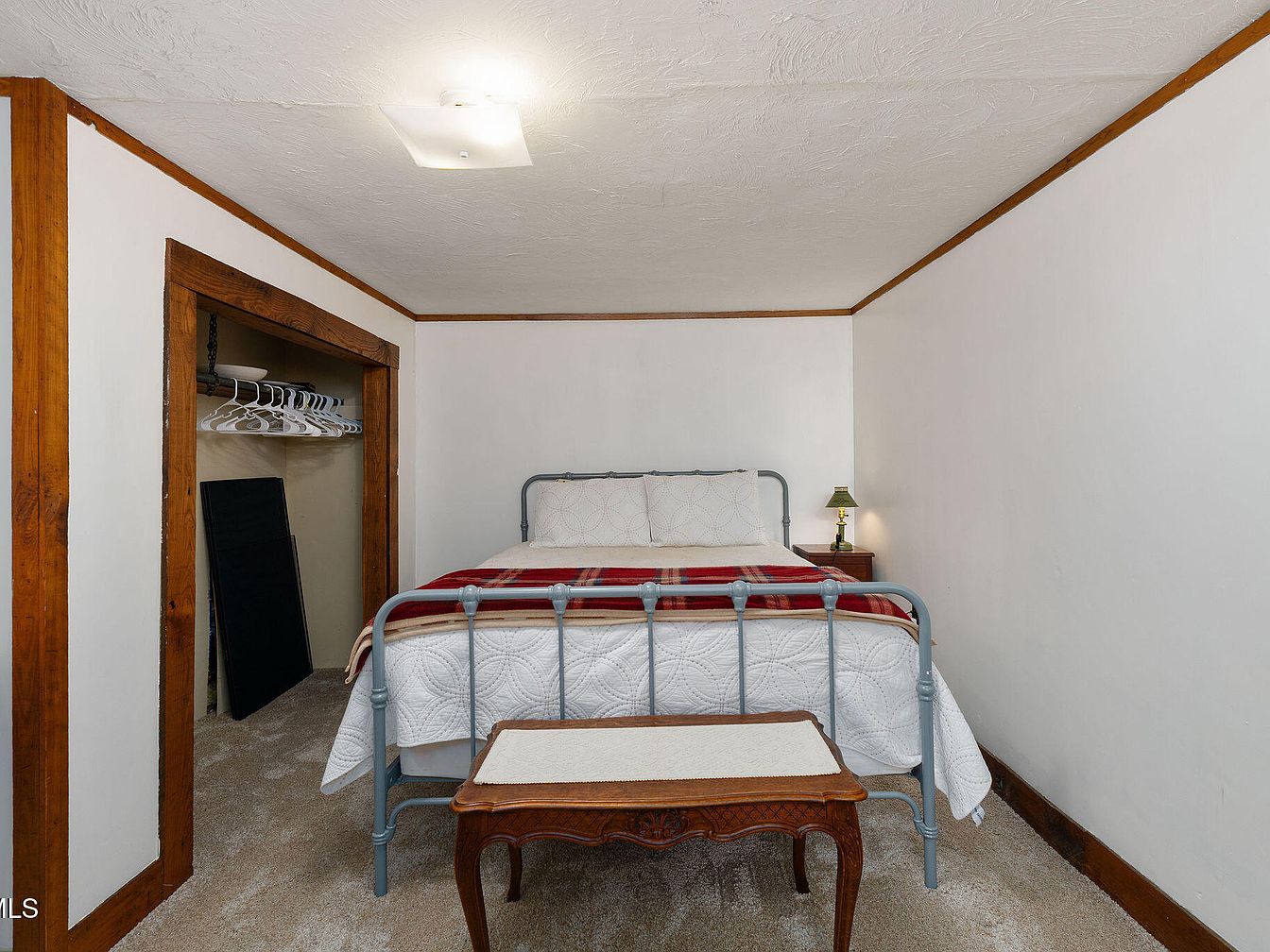 A welcoming bedroom featuring a metal-frame double bed dressed in crisp white linens and a red plaid throw, ideal for relaxation after a busy day. The neutral palette of soft beige carpeting and white textured walls, accented by natural wood trim, creates a warm and classic ambiance. A small nightstand with a lamp offers gentle nighttime lighting, while an open closet with several hangers provides storage space for family clothing or belongings. The vintage-style wooden bench at the foot of the bed adds charm and practicality, making this space both comfortable and family-friendly, perfect for restful nights and peaceful mornings.
