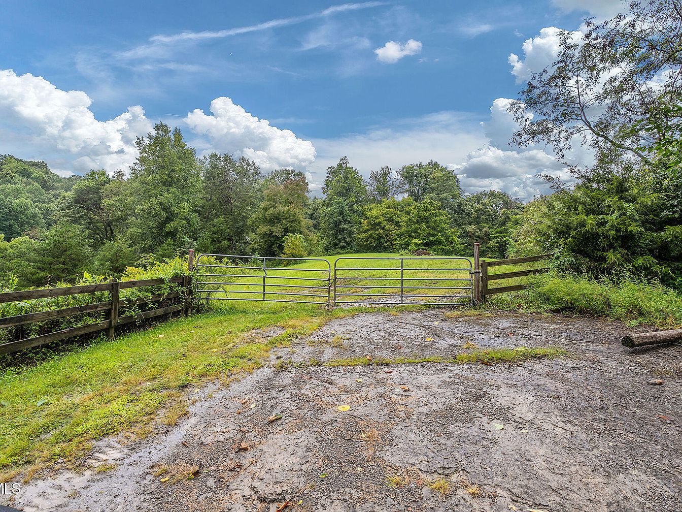 A peaceful entryway leads from a rustic gravel driveway to an expansive, fenced backyard. Framed by a sturdy wooden fence and a secure metal gate, the space opens into a large, grassy field surrounded by mature trees, providing both privacy and a natural barrier. The area is ideal for children and pets to play freely in a safe, open environment. Lush greenery lines both sides, creating a scenic and welcoming transition between outdoor living and the surrounding forest. The vibrant greens contrast beautifully with the soft blue sky and billowing white clouds, embodying a serene, family-friendly outdoor retreat.
