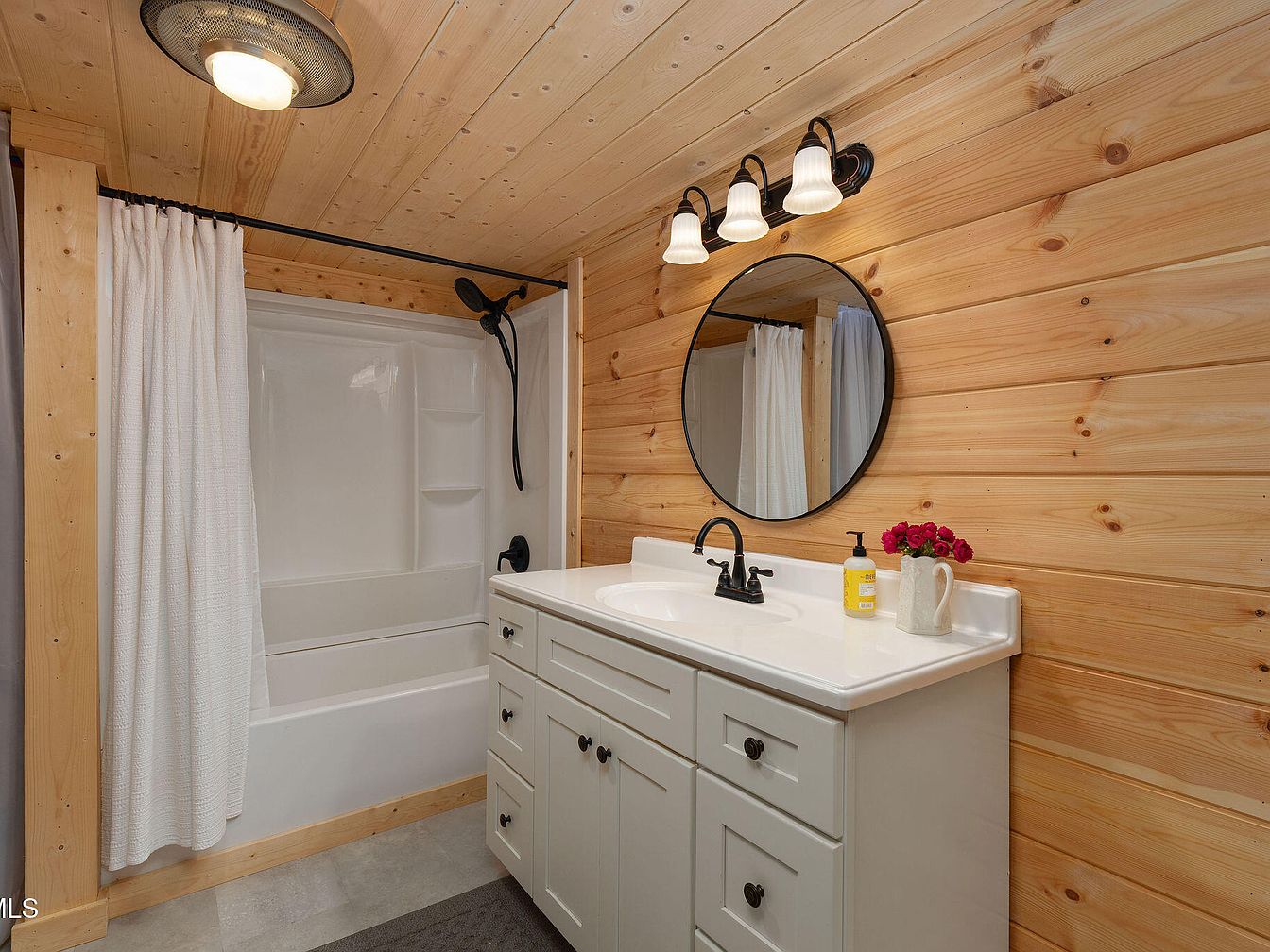 A warm, inviting bathroom features natural wood paneling on the walls and ceiling, creating a cozy cabin-like atmosphere. The white vanity is spacious with multiple drawers and cabinets, topped by a polished countertop and a simple black faucet. Above the vanity hangs a large round mirror, flanked by three farmhouse-style light fixtures that provide soft illumination. The tub-shower combo has a handy built-in shelving niche and is flanked by a crisp white shower curtain, making it functional for family use. Neutral flooring and thoughtful details like a pitcher of flowers and hand soap complete the family-friendly, easy-to-clean space.