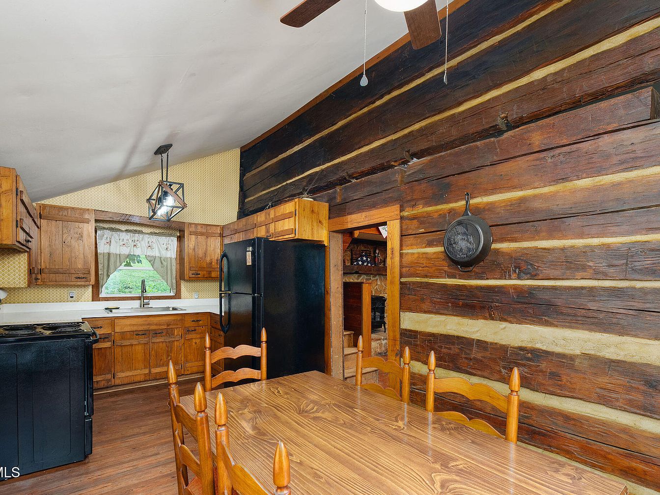 This inviting kitchen and dining area features rustic log cabin walls with rich, exposed wooden beams and chinking, conveying a cozy, country ambiance perfect for families. The wooden cabinetry and furniture, including a sturdy dining table with seating for at least six, foster a warm, communal space for shared meals and family gatherings. The black appliances, such as the refrigerator and stove, offer modern convenience while complementing the earthy tones. A geometric pendant light over the sink and a large window dressed with a floral valance bring brightness and charm, making this space both functional and welcoming for everyday family life.
